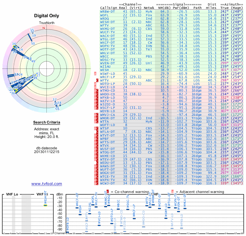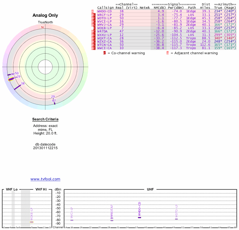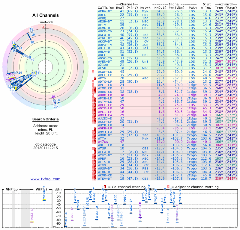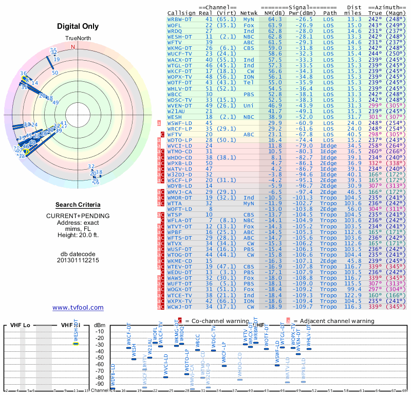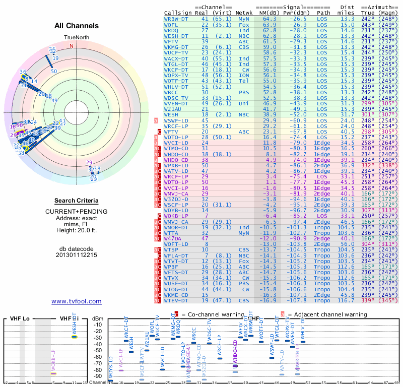 Here are the results for your location. The transmitter database was last updated on June 7, 2013. For more information about these plots and how to interpret them, please check out the Signal Analysis FAQ.
