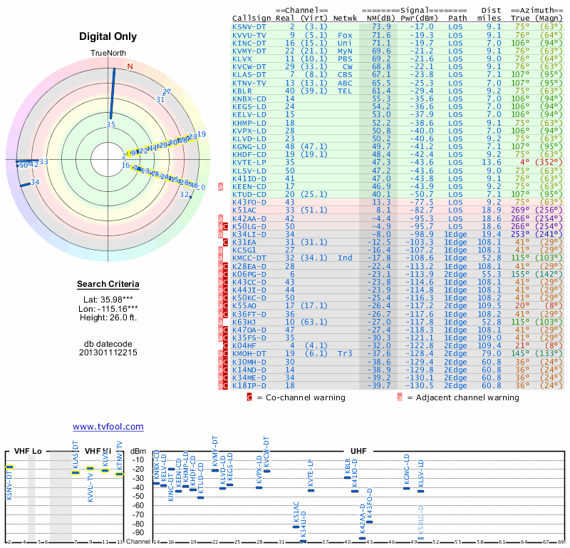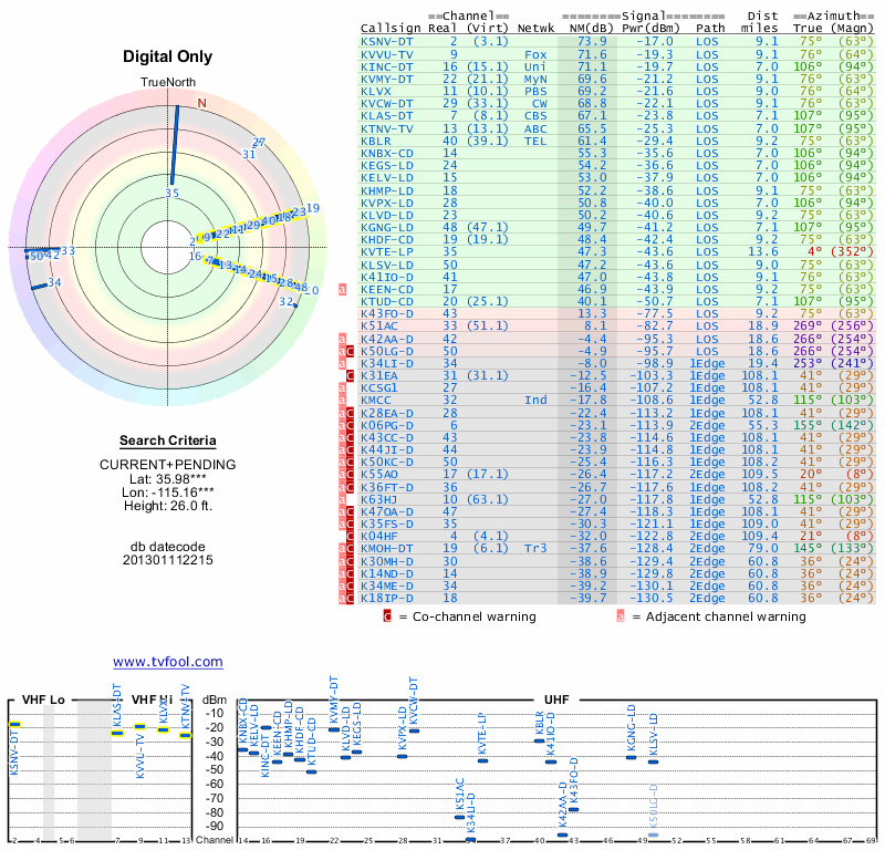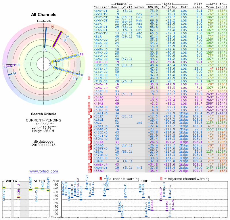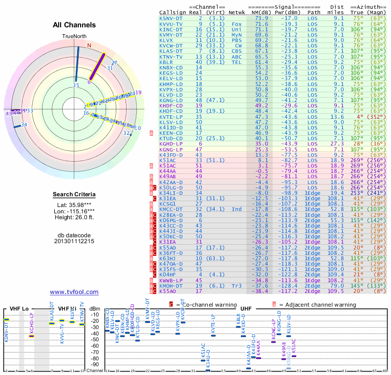 Here are the results for your location. The transmitter database was last updated on June 7, 2013. For more information about these plots and how to interpret them, please check out the Signal Analysis FAQ.