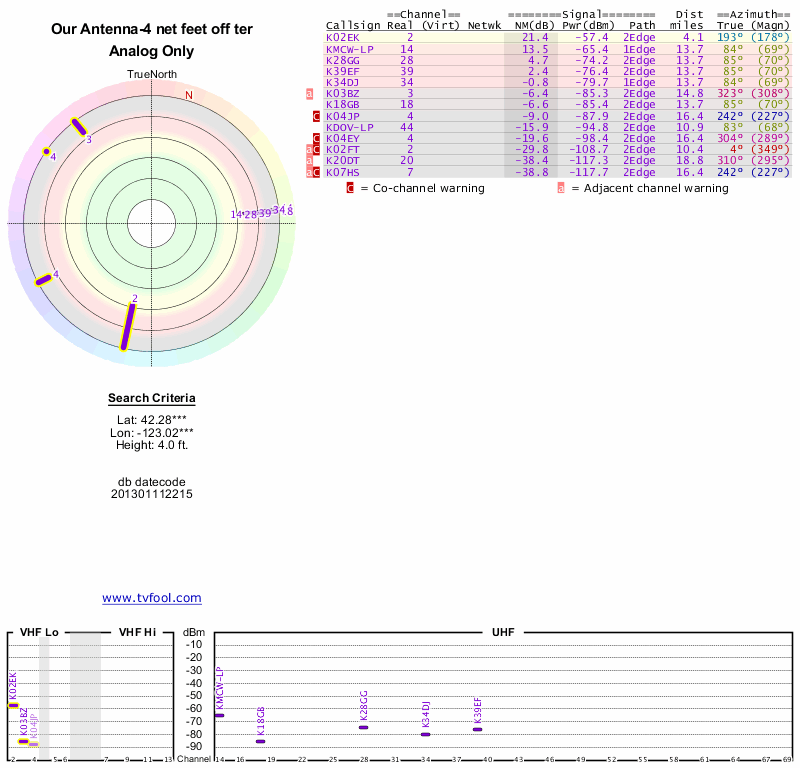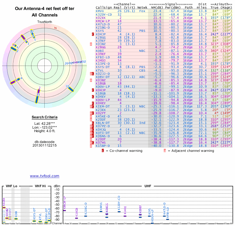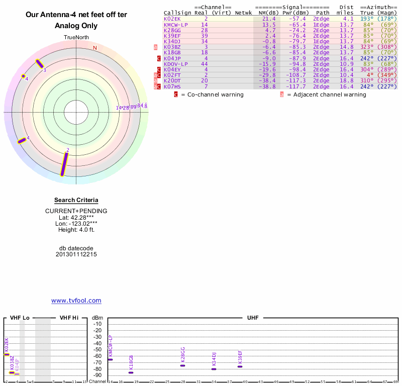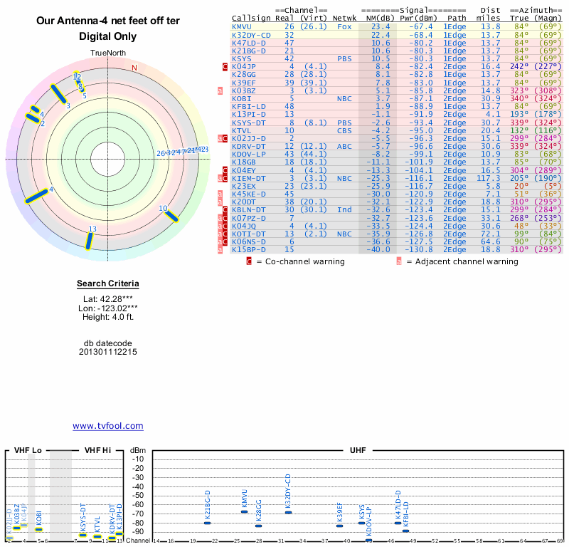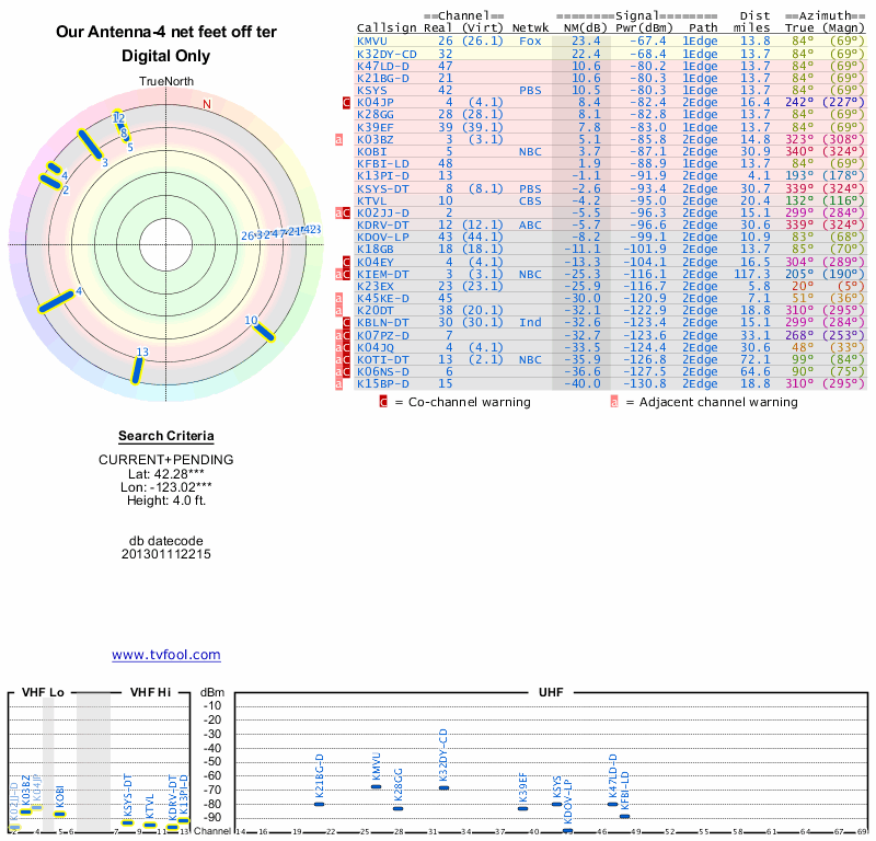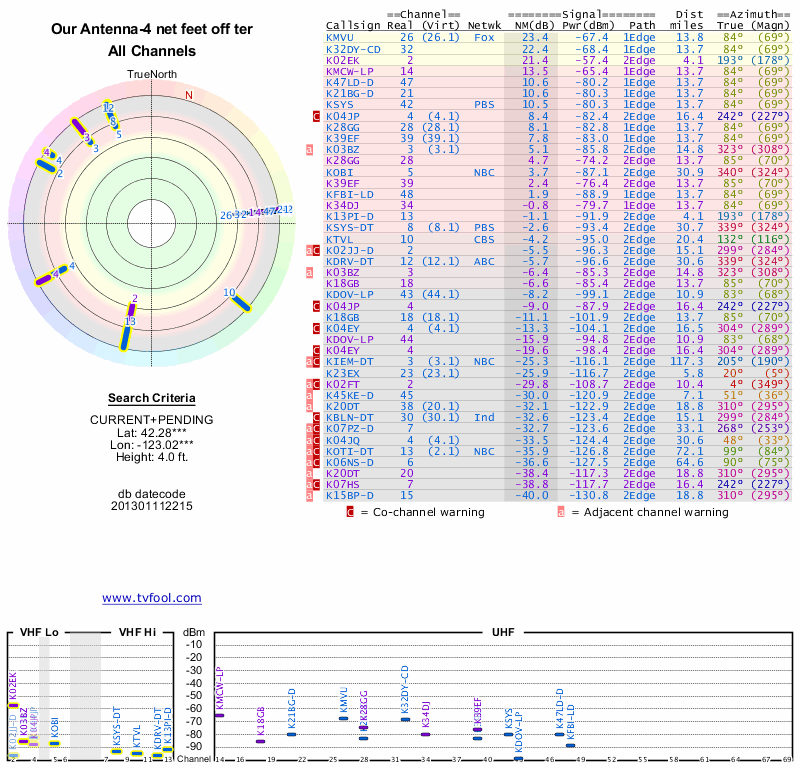 Here are the results for your location. The transmitter database was last updated on June 7, 2013. For more information about these plots and how to interpret them, please check out the Signal Analysis FAQ.