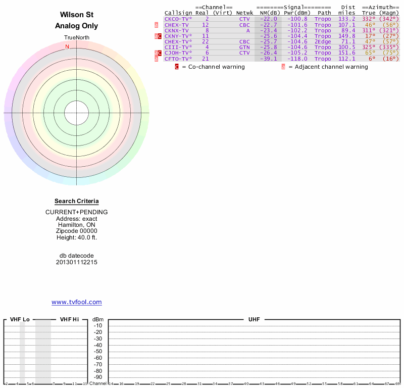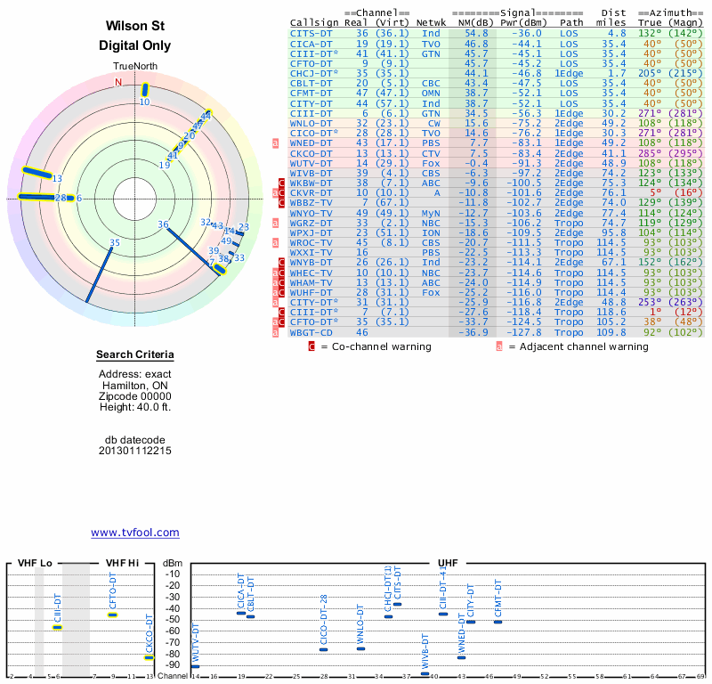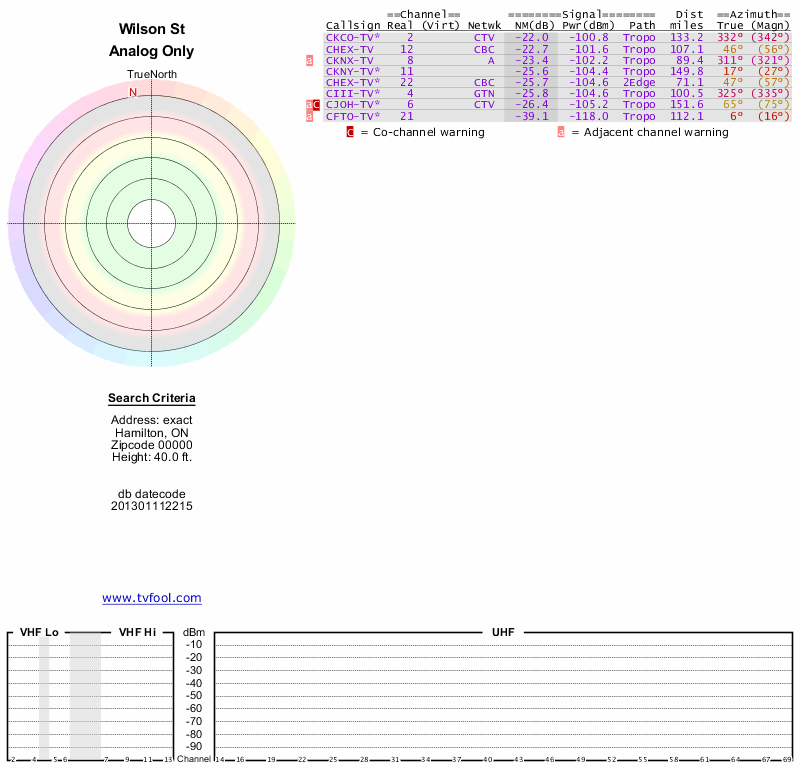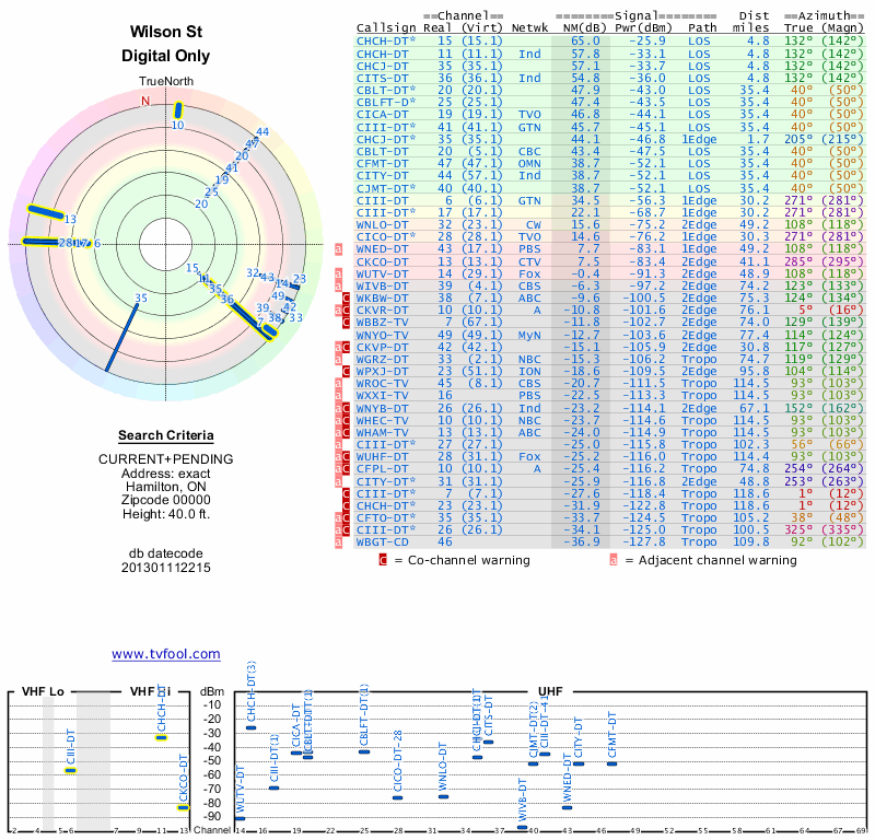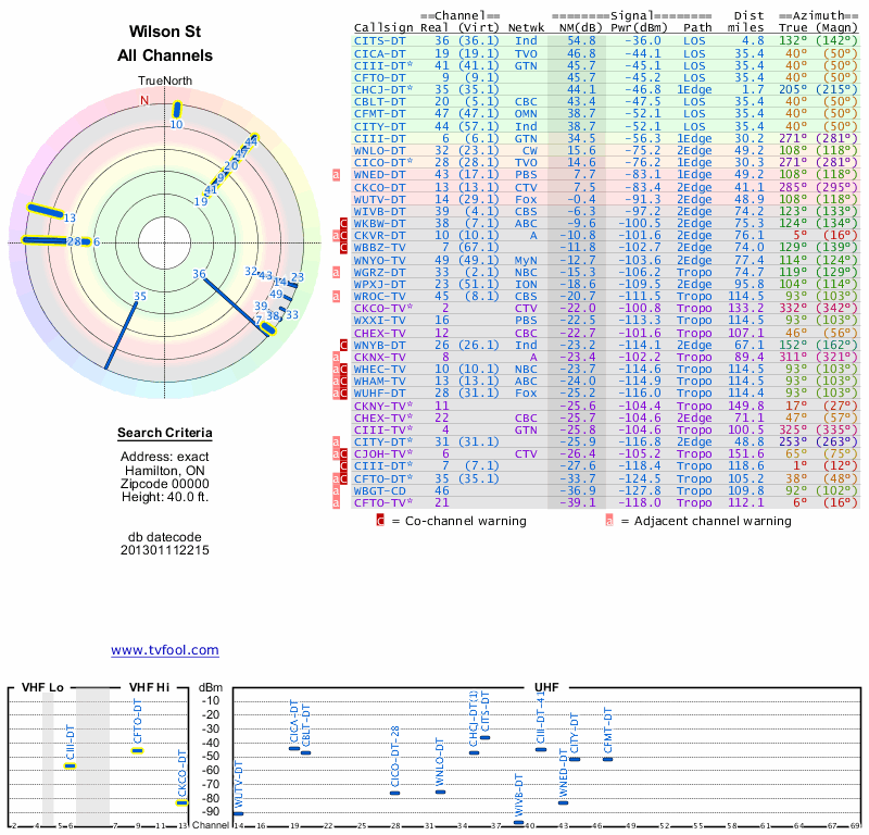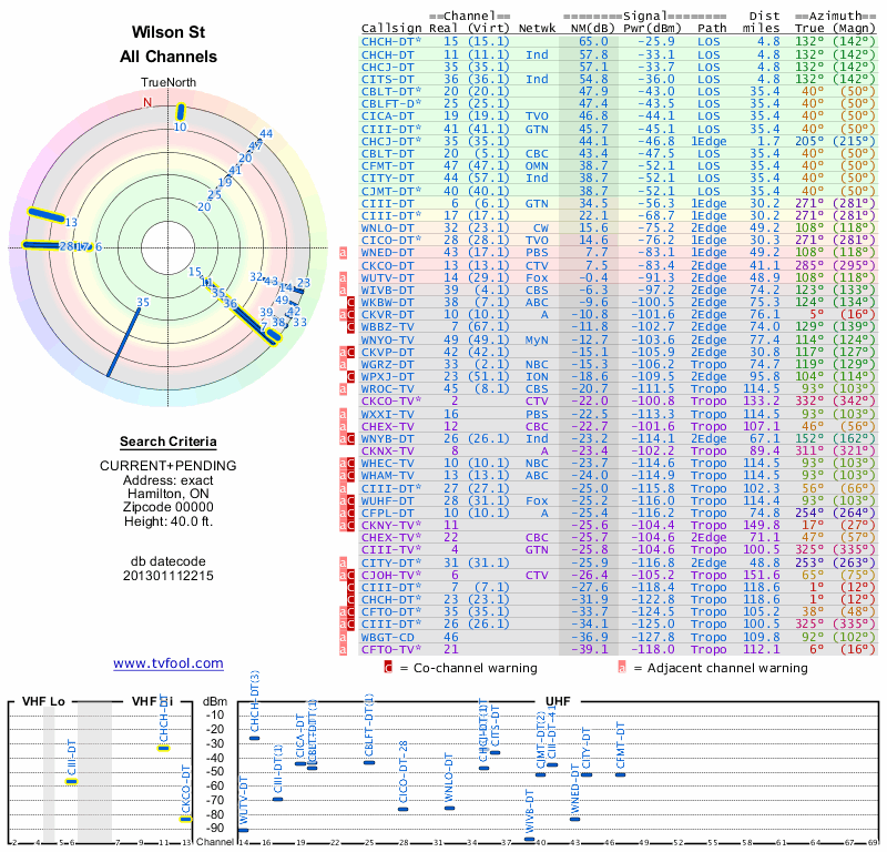 Here are the results for your location. The transmitter database was last updated on June 7, 2013. For more information about these plots and how to interpret them, please check out the Signal Analysis FAQ.