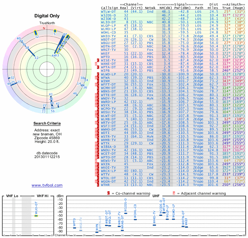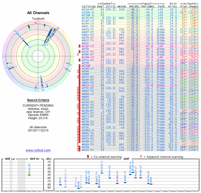 Here are the results for your location. The transmitter database was last updated on June 7, 2013. For more information about these plots and how to interpret them, please check out the Signal Analysis FAQ.