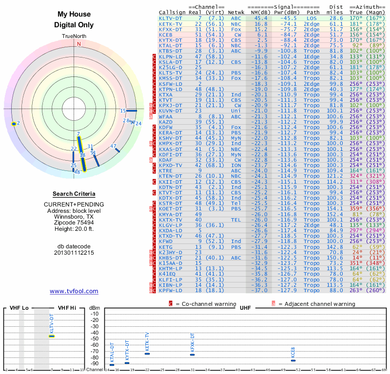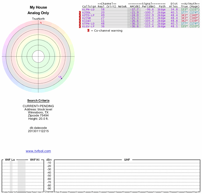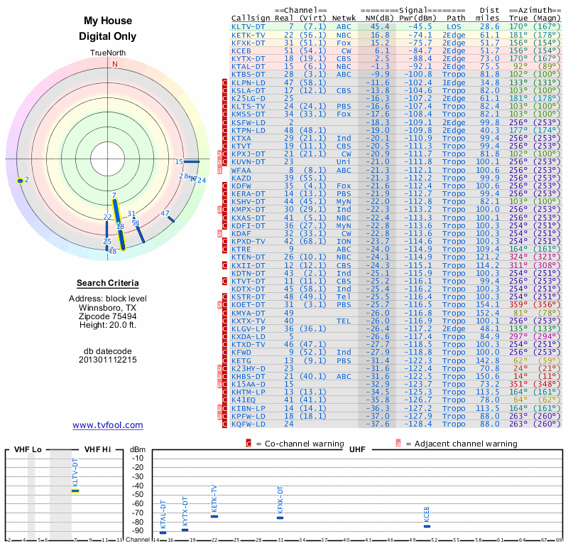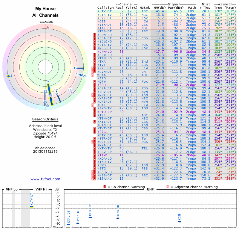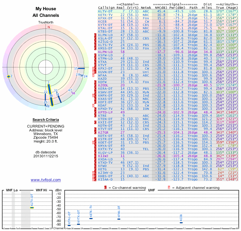 Here are the results for your location. The transmitter database was last updated on June 7, 2013. For more information about these plots and how to interpret them, please check out the Signal Analysis FAQ.
