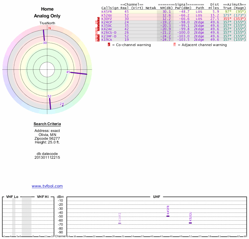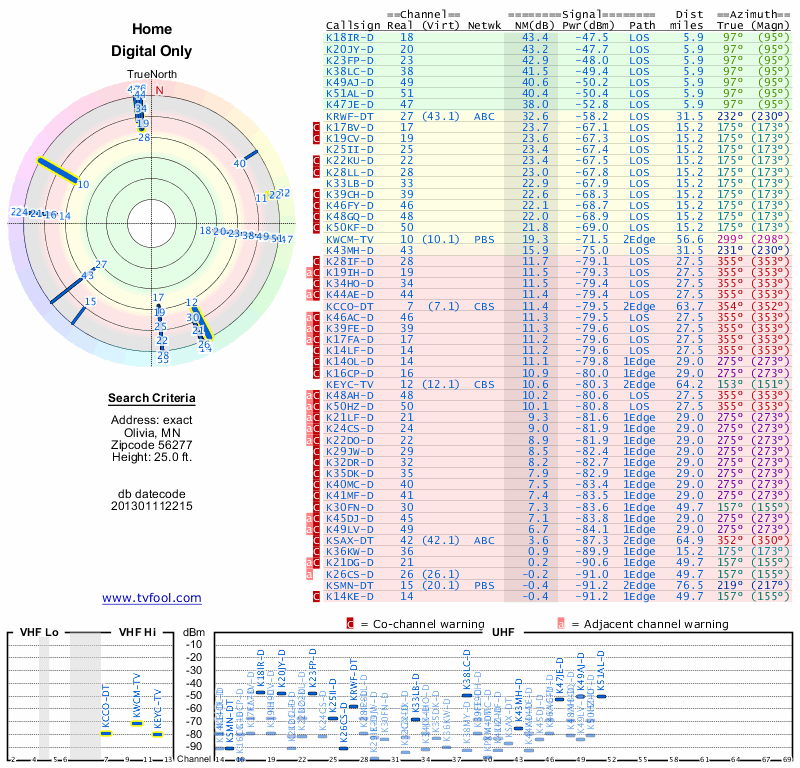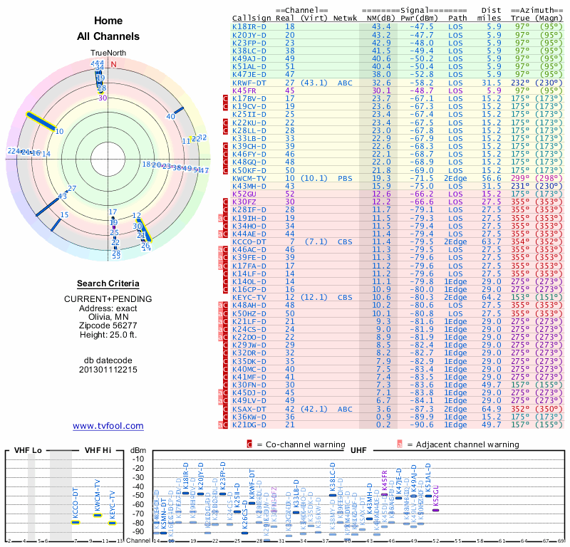 Here are the results for your location. The transmitter database was last updated on June 7, 2013. For more information about these plots and how to interpret them, please check out the Signal Analysis FAQ.