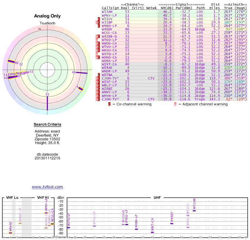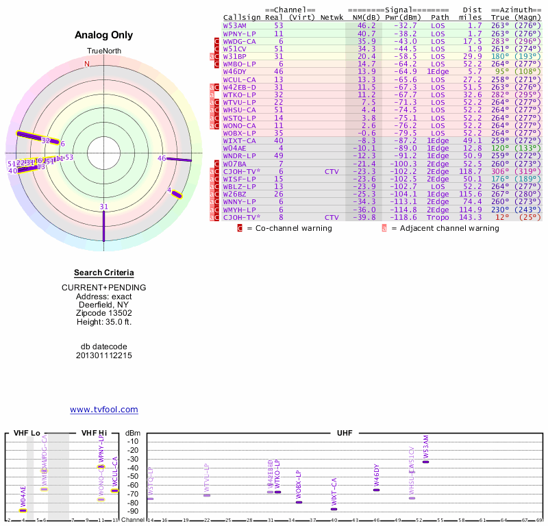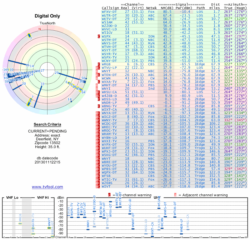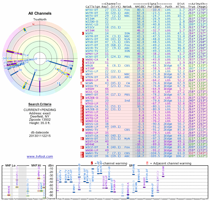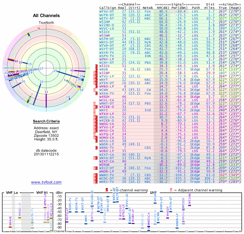 Here are the results for your location. The transmitter database was last updated on June 7, 2013. For more information about these plots and how to interpret them, please check out the Signal Analysis FAQ.