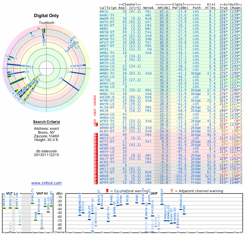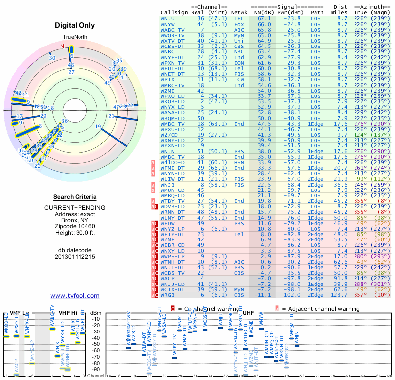 Here are the results for your location. The transmitter database was last updated on June 7, 2013. For more information about these plots and how to interpret them, please check out the Signal Analysis FAQ.