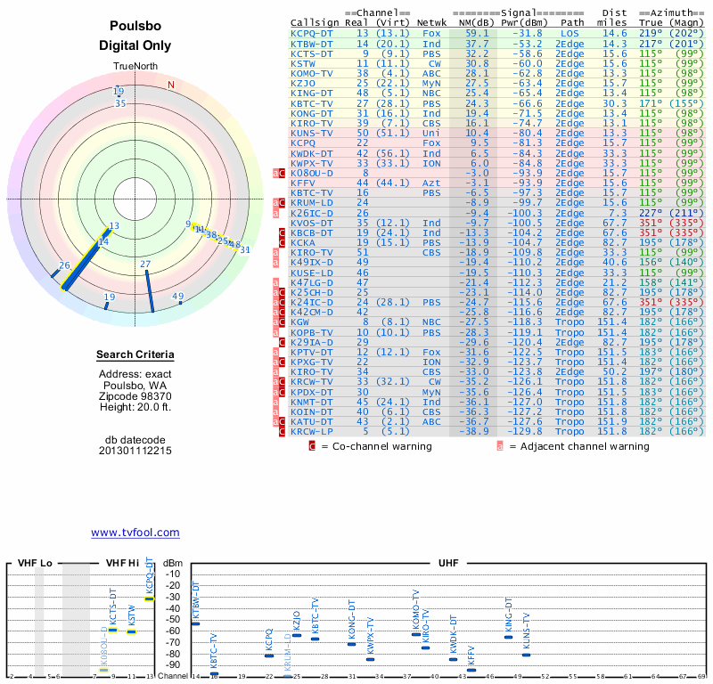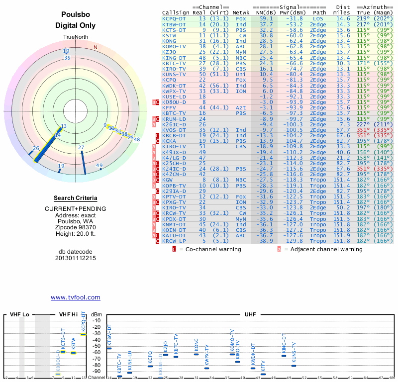 Here are the results for your location. The transmitter database was last updated on June 7, 2013. For more information about these plots and how to interpret them, please check out the Signal Analysis FAQ.