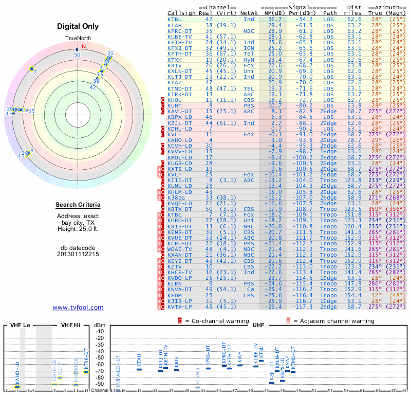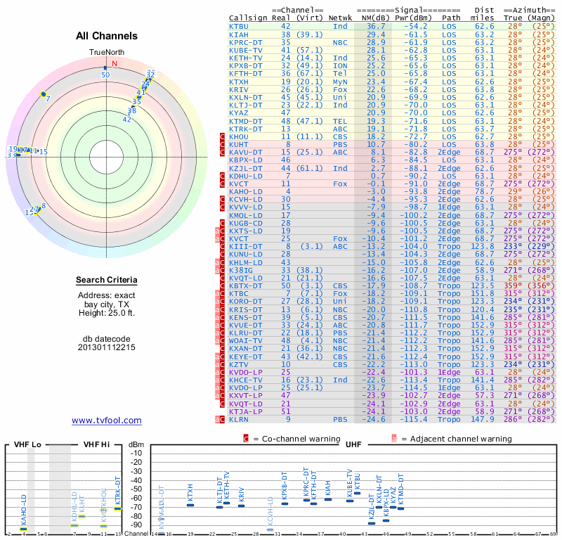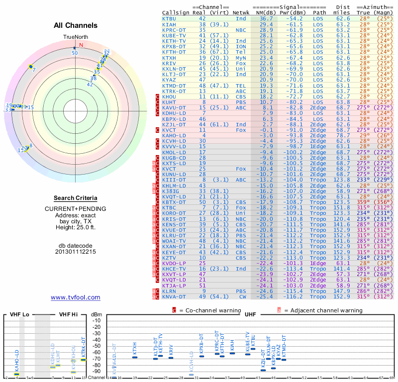 Here are the results for your location. The transmitter database was last updated on June 7, 2013. For more information about these plots and how to interpret them, please check out the Signal Analysis FAQ.