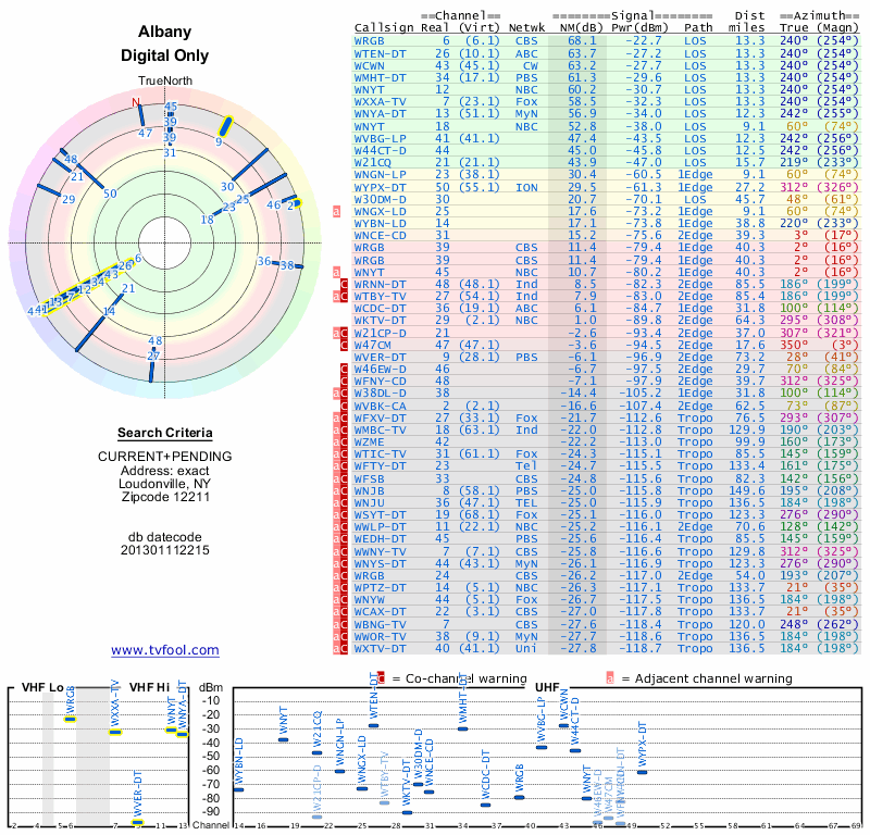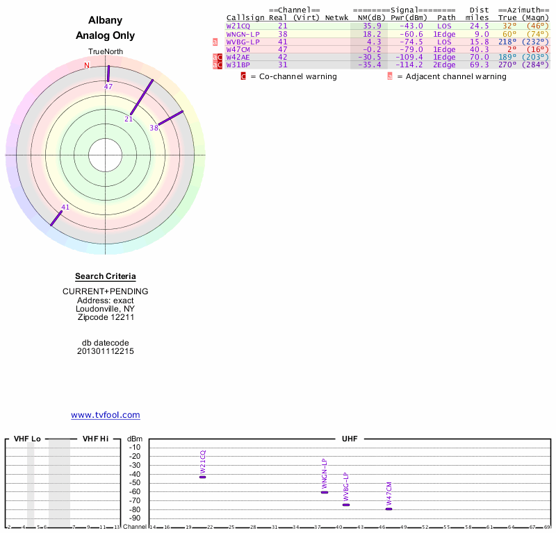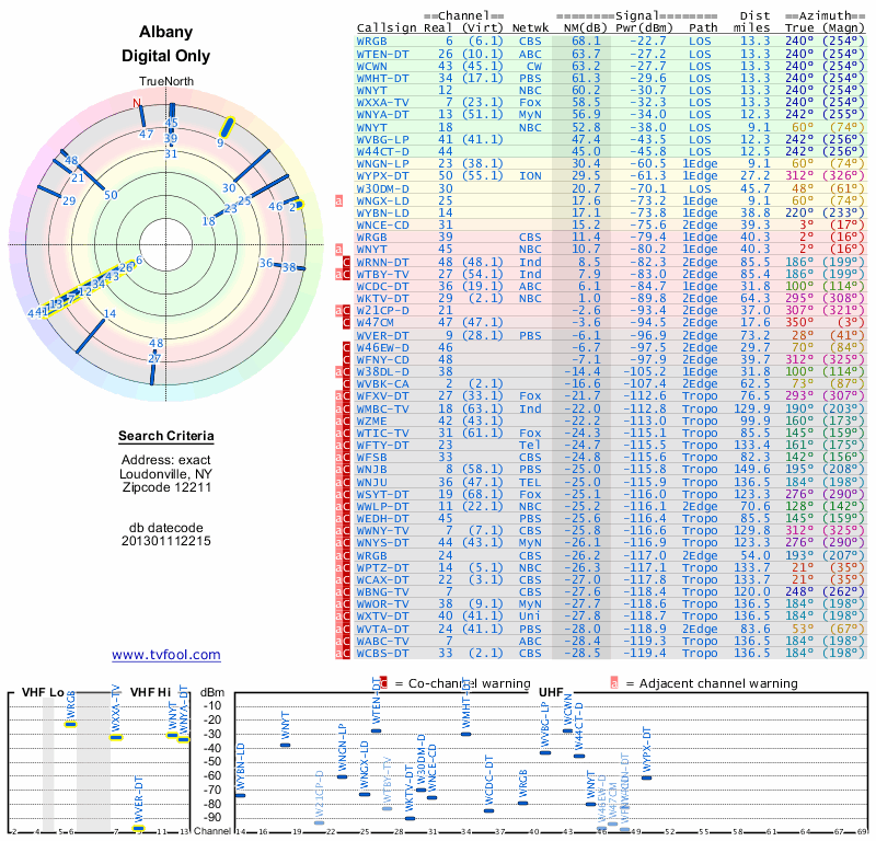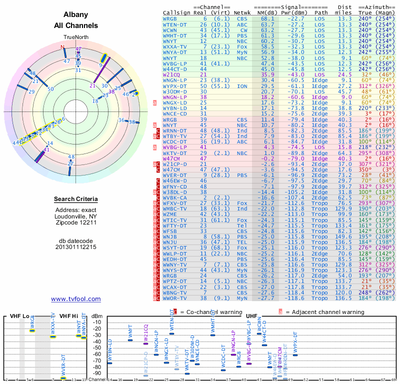 Here are the results for your location. The transmitter database was last updated on June 7, 2013. For more information about these plots and how to interpret them, please check out the Signal Analysis FAQ.