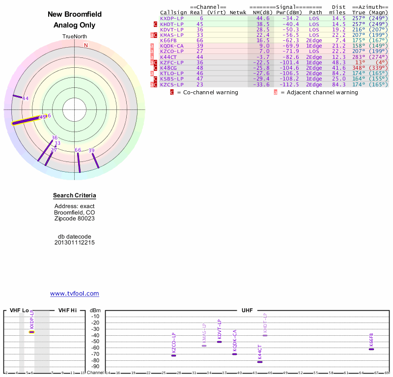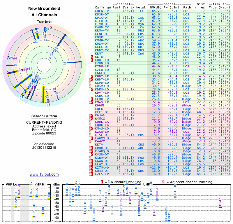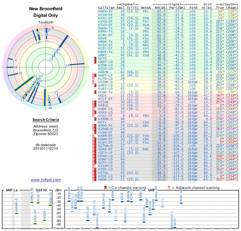 Here are the results for your location. The transmitter database was last updated on June 7, 2013. For more information about these plots and how to interpret them, please check out the Signal Analysis FAQ.