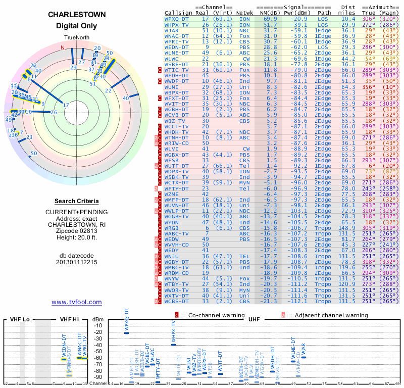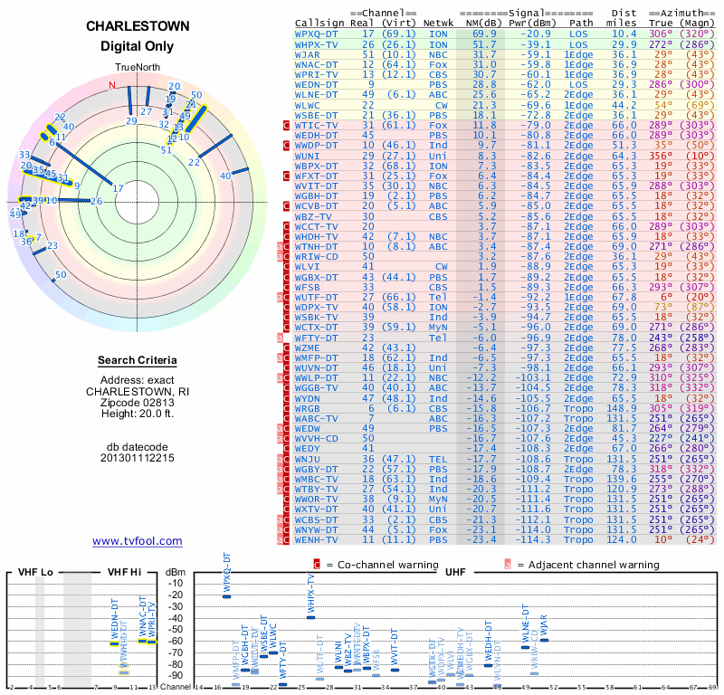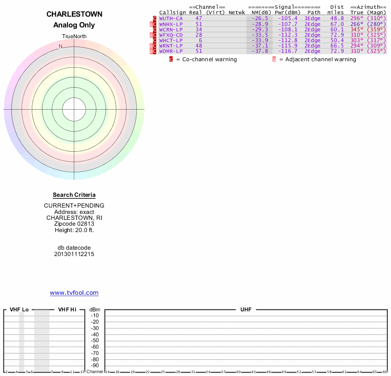 Here are the results for your location. The transmitter database was last updated on June 7, 2013. For more information about these plots and how to interpret them, please check out the Signal Analysis FAQ.