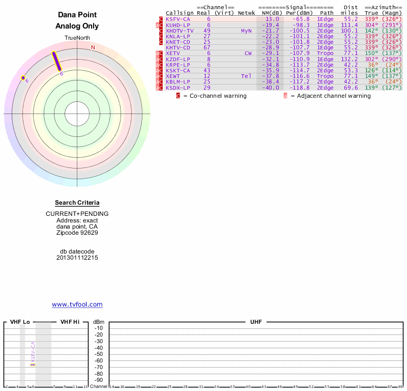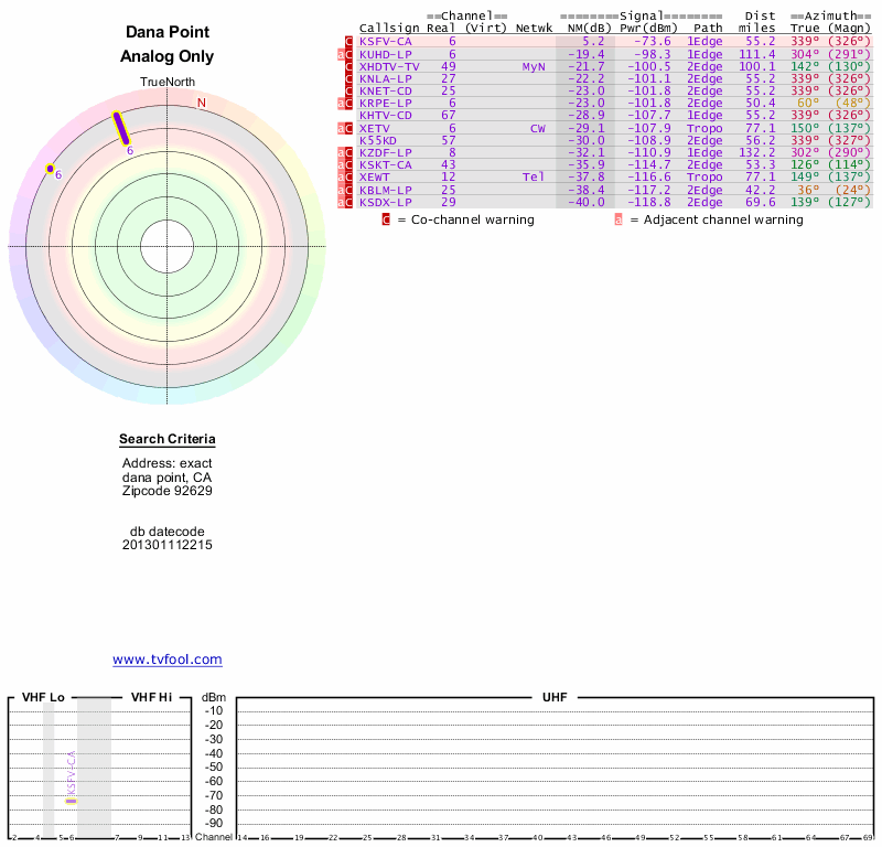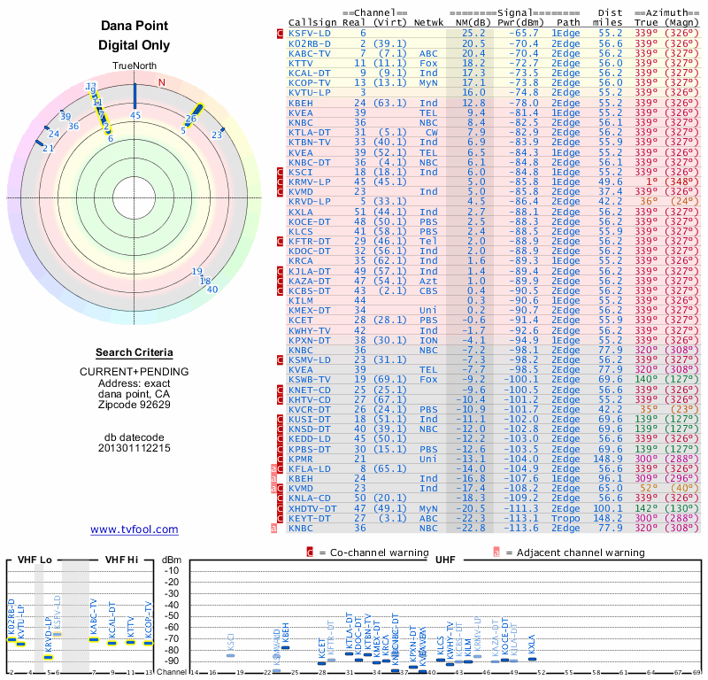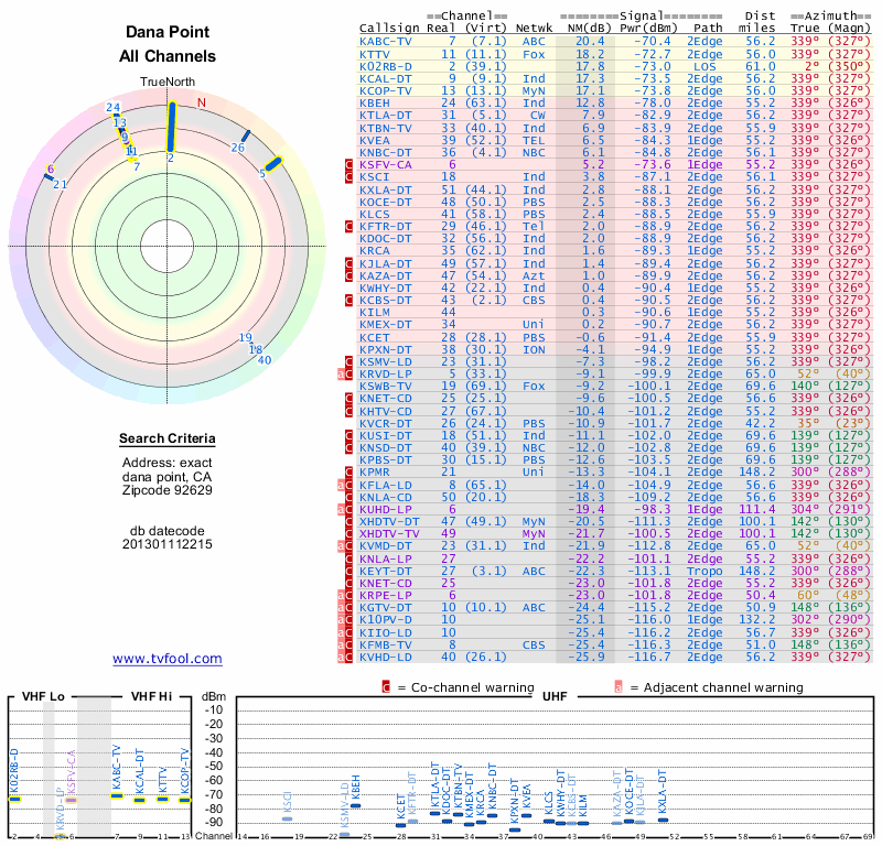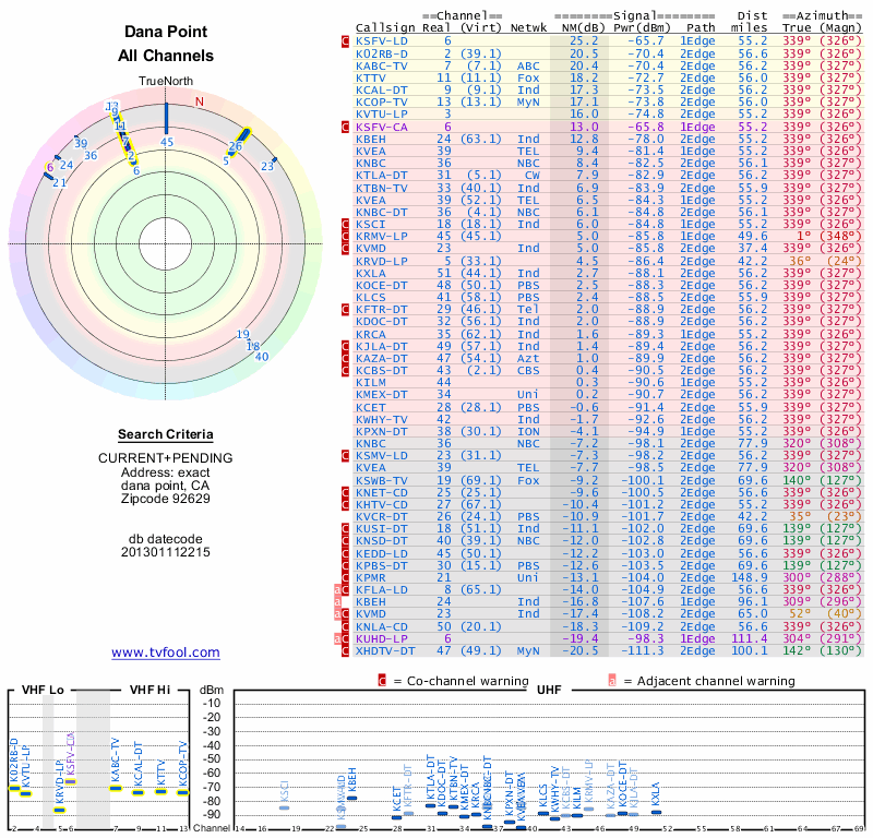 Here are the results for your location. The transmitter database was last updated on June 7, 2013. For more information about these plots and how to interpret them, please check out the Signal Analysis FAQ.