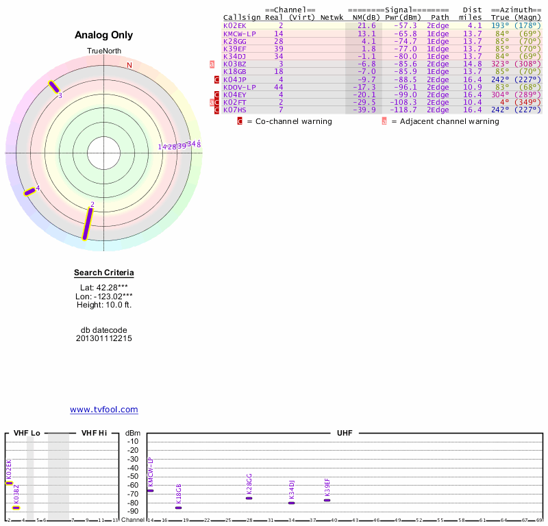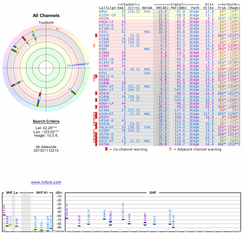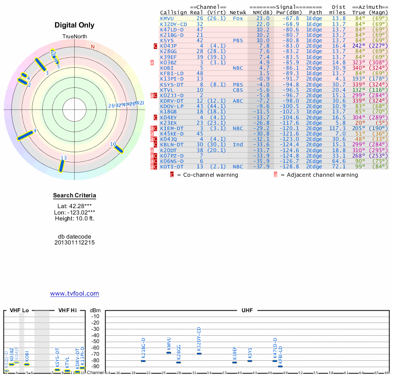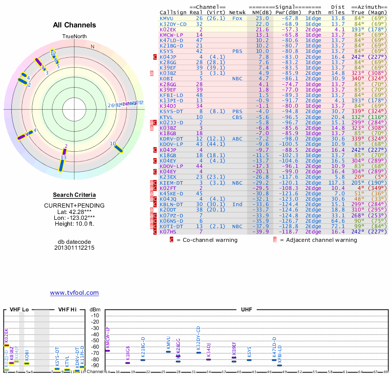 Here are the results for your location. The transmitter database was last updated on June 7, 2013. For more information about these plots and how to interpret them, please check out the Signal Analysis FAQ.