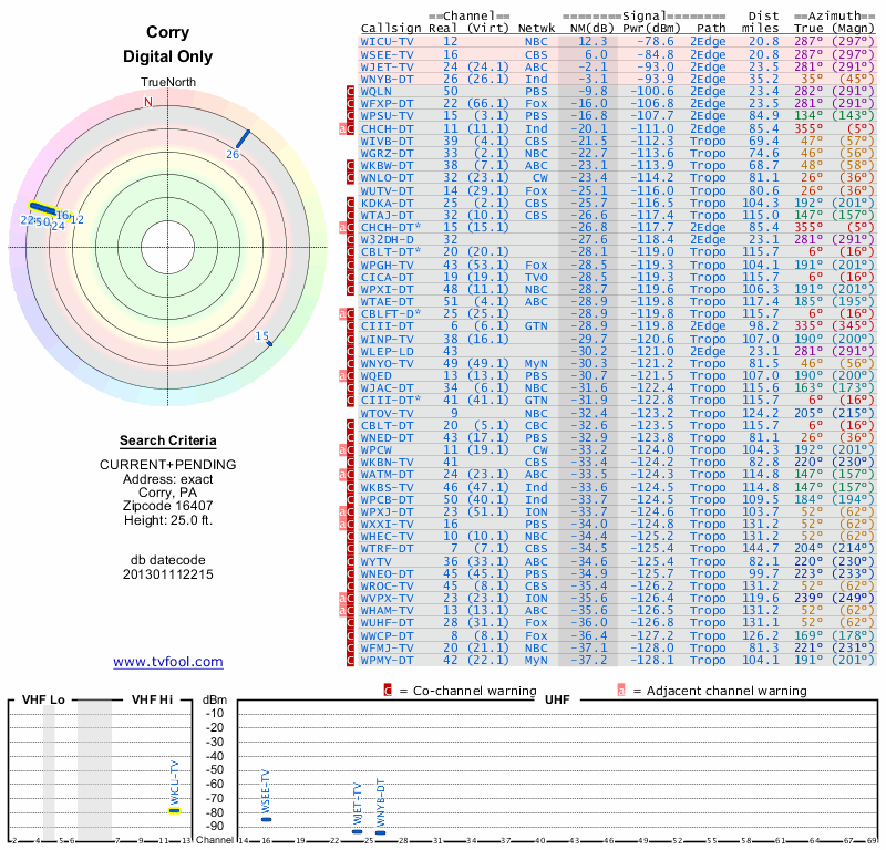Here are the results for your location. The transmitter database was last updated on June 7, 2013. For more information about these plots and how to interpret them, please check out the Signal Analysis FAQ.