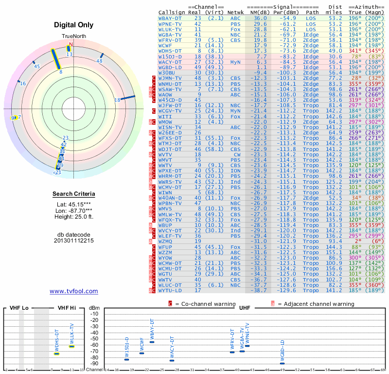 Here are the results for your location. The transmitter database was last updated on June 7, 2013. For more information about these plots and how to interpret them, please check out the Signal Analysis FAQ.