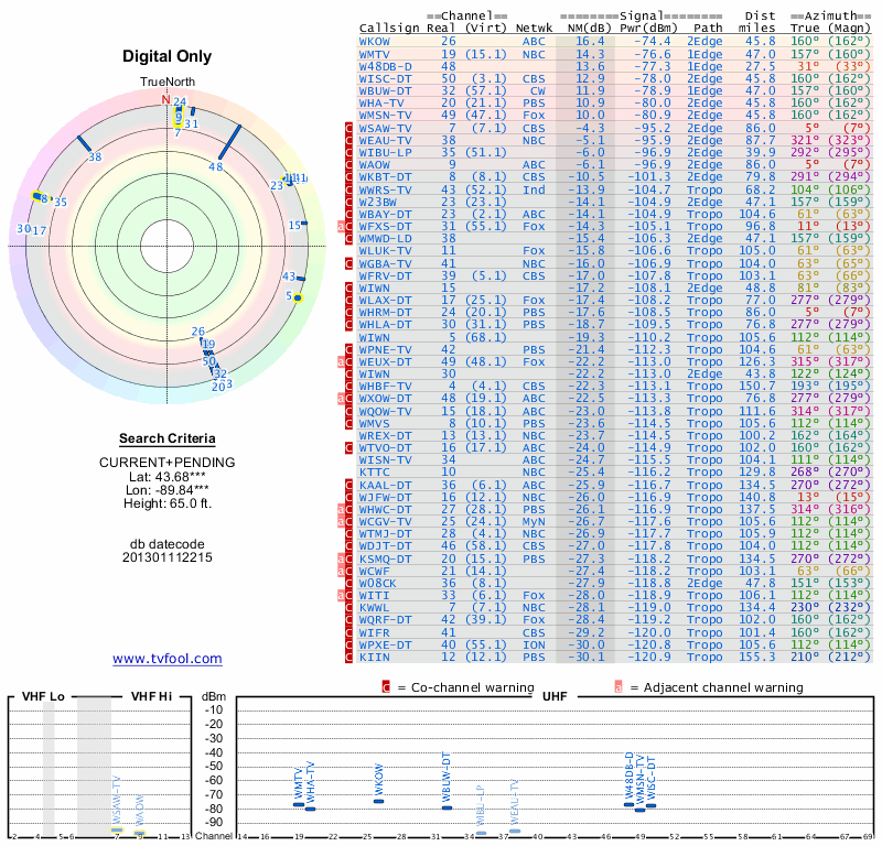 Here are the results for your location. The transmitter database was last updated on June 7, 2013. For more information about these plots and how to interpret them, please check out the Signal Analysis FAQ.