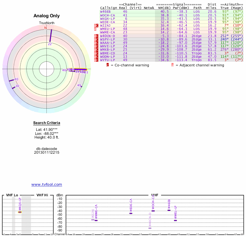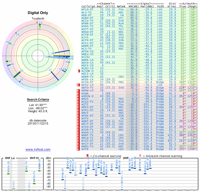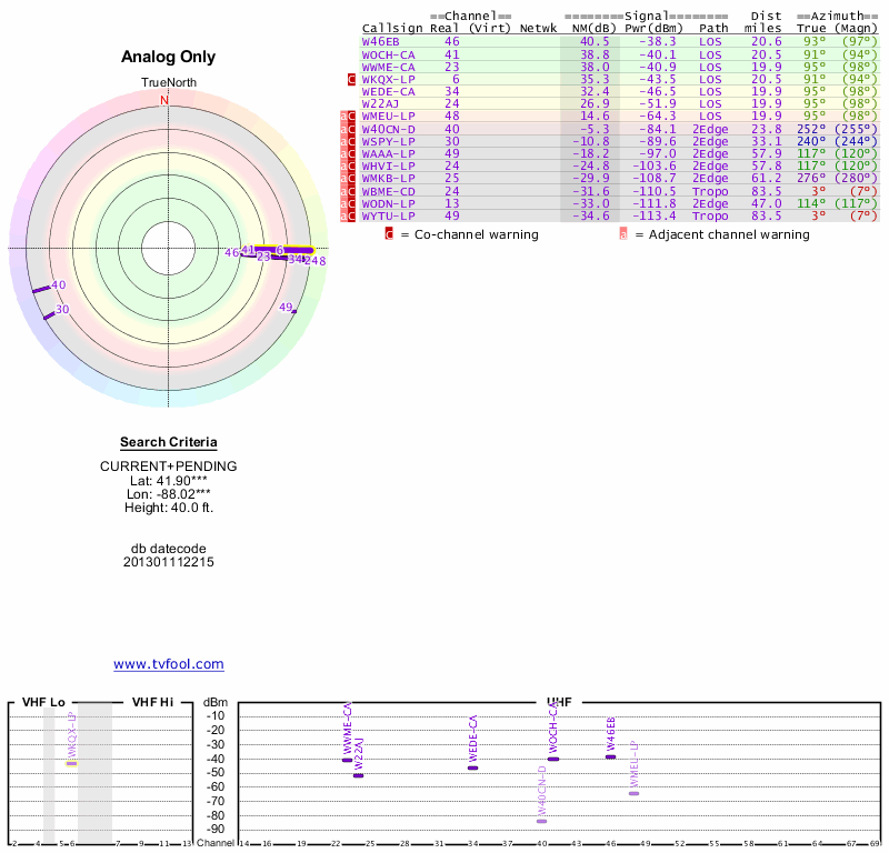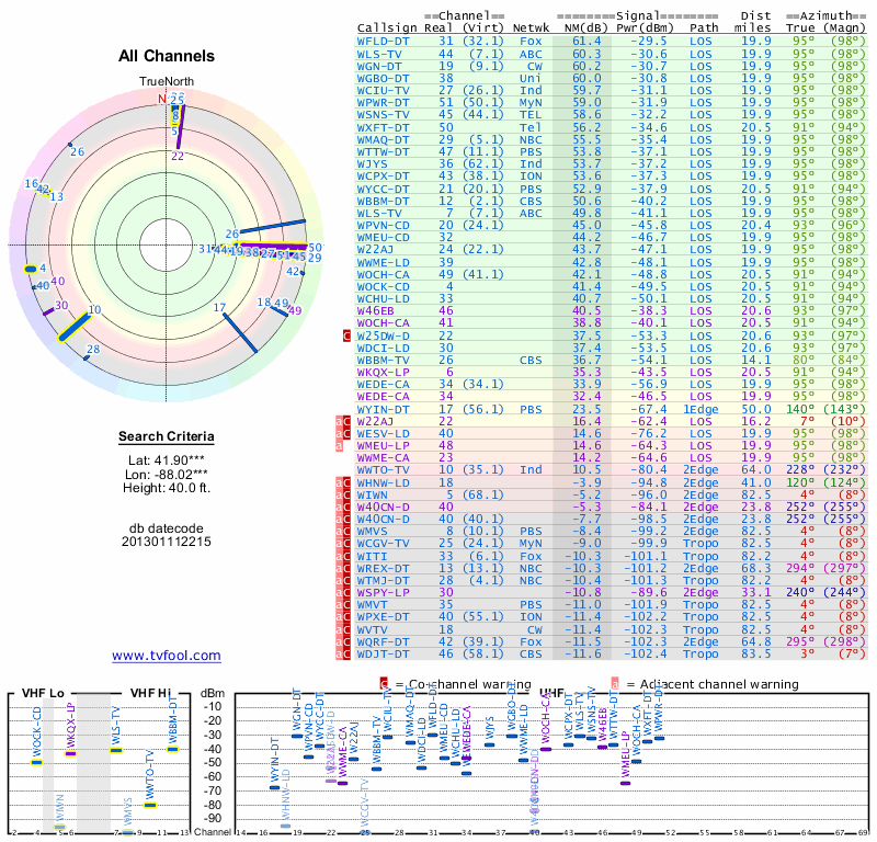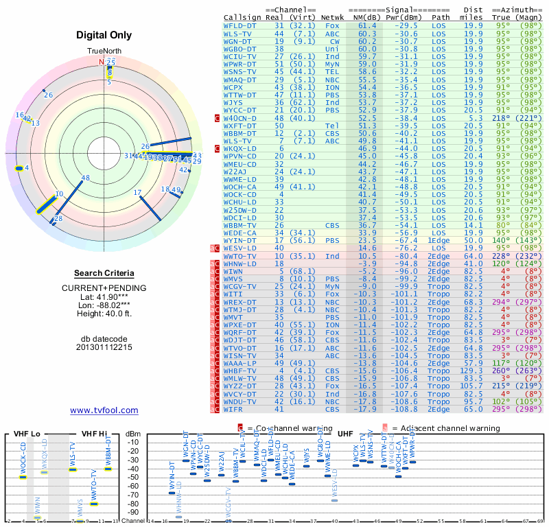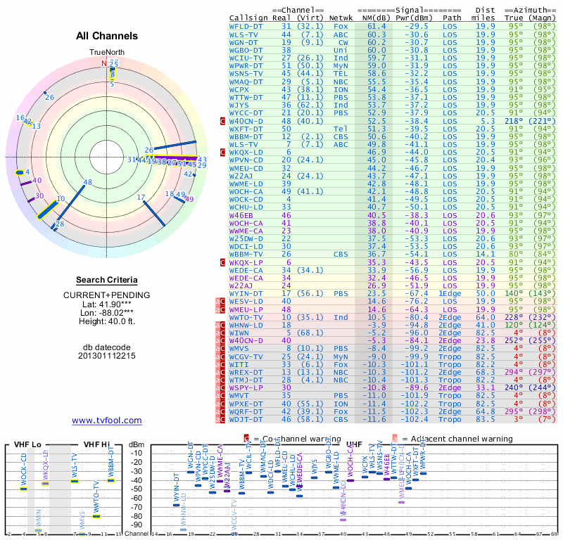 Here are the results for your location. The transmitter database was last updated on June 7, 2013. For more information about these plots and how to interpret them, please check out the Signal Analysis FAQ.