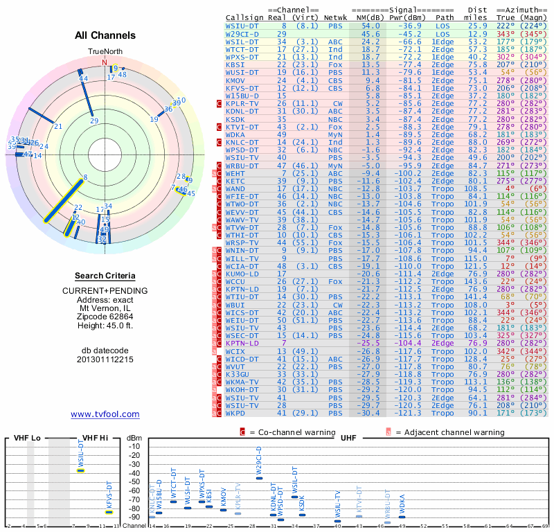 Here are the results for your location. The transmitter database was last updated on June 7, 2013. For more information about these plots and how to interpret them, please check out the Signal Analysis FAQ.