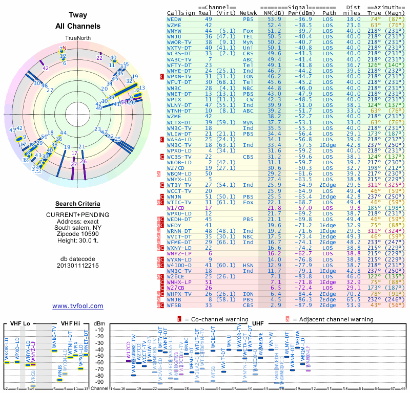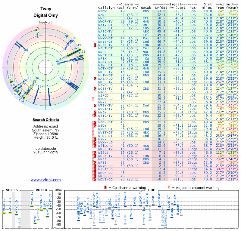 Here are the results for your location. The transmitter database was last updated on June 7, 2013. For more information about these plots and how to interpret them, please check out the Signal Analysis FAQ.