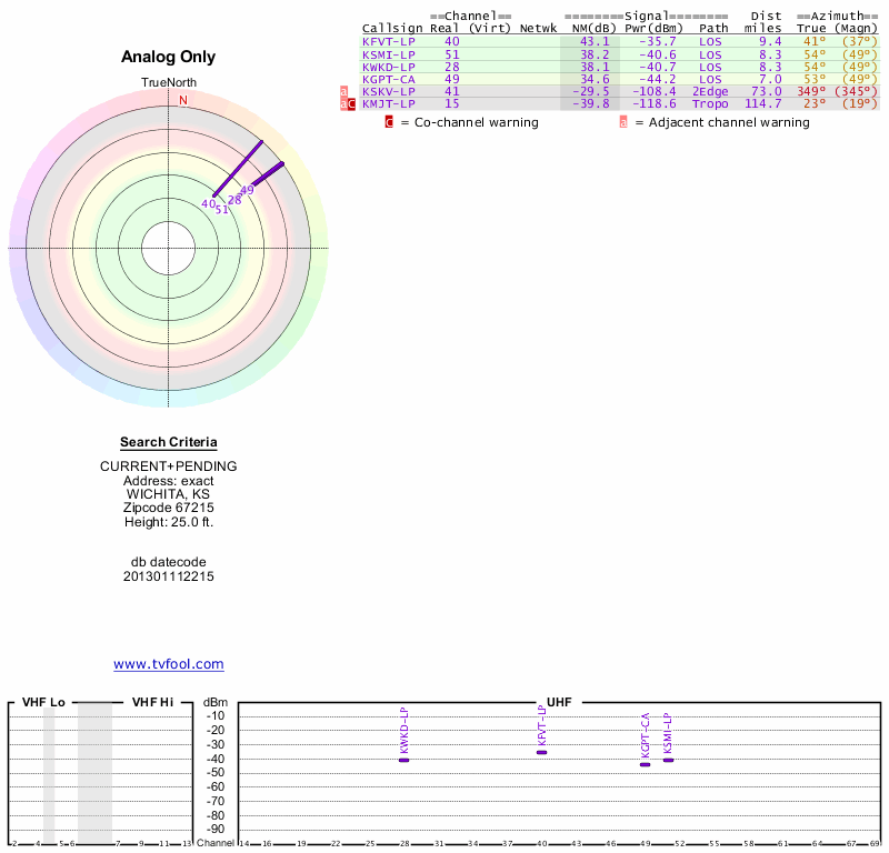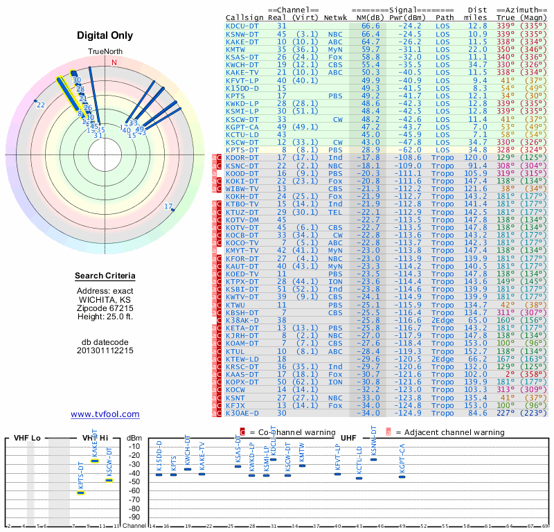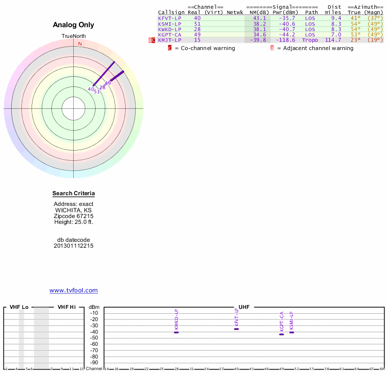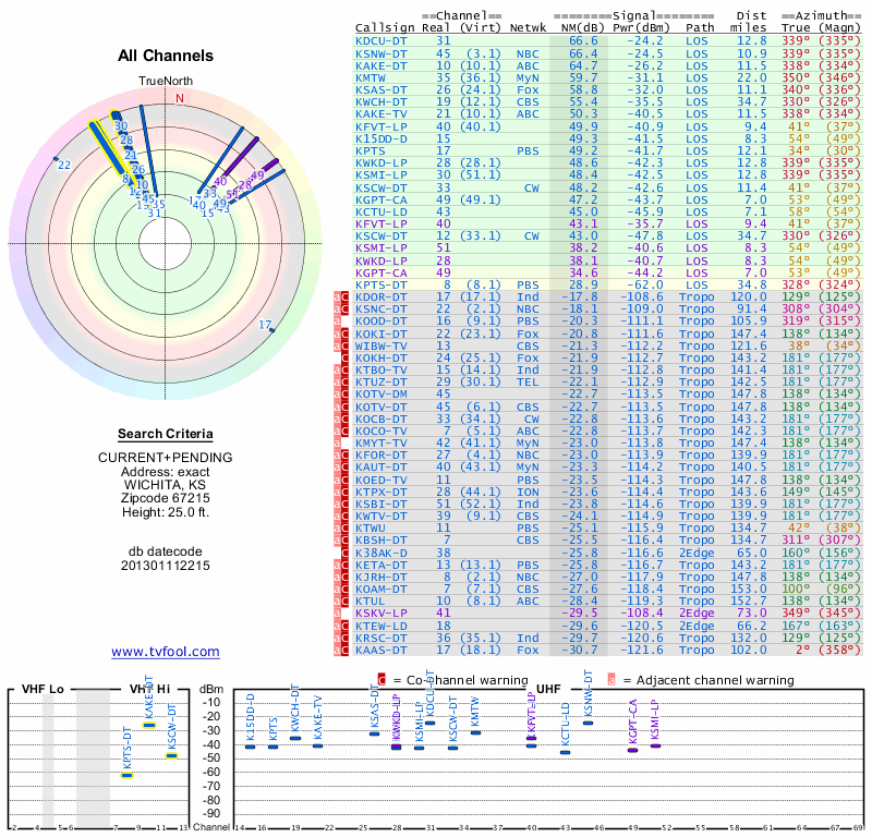 Here are the results for your location. The transmitter database was last updated on June 7, 2013. For more information about these plots and how to interpret them, please check out the Signal Analysis FAQ.