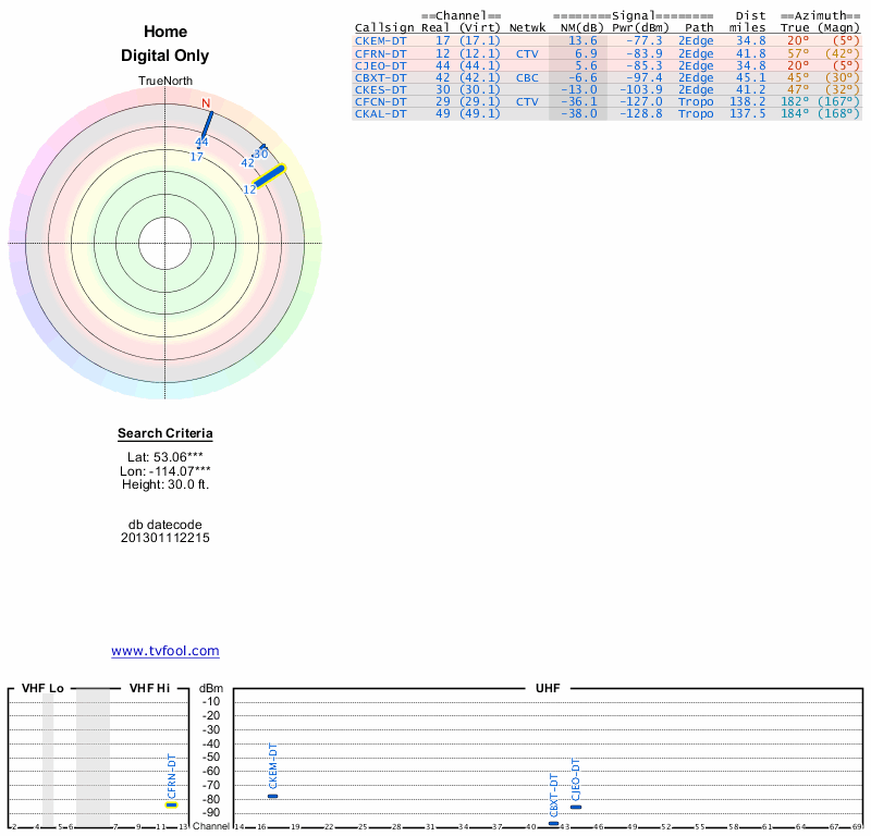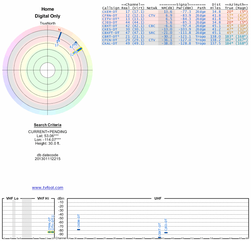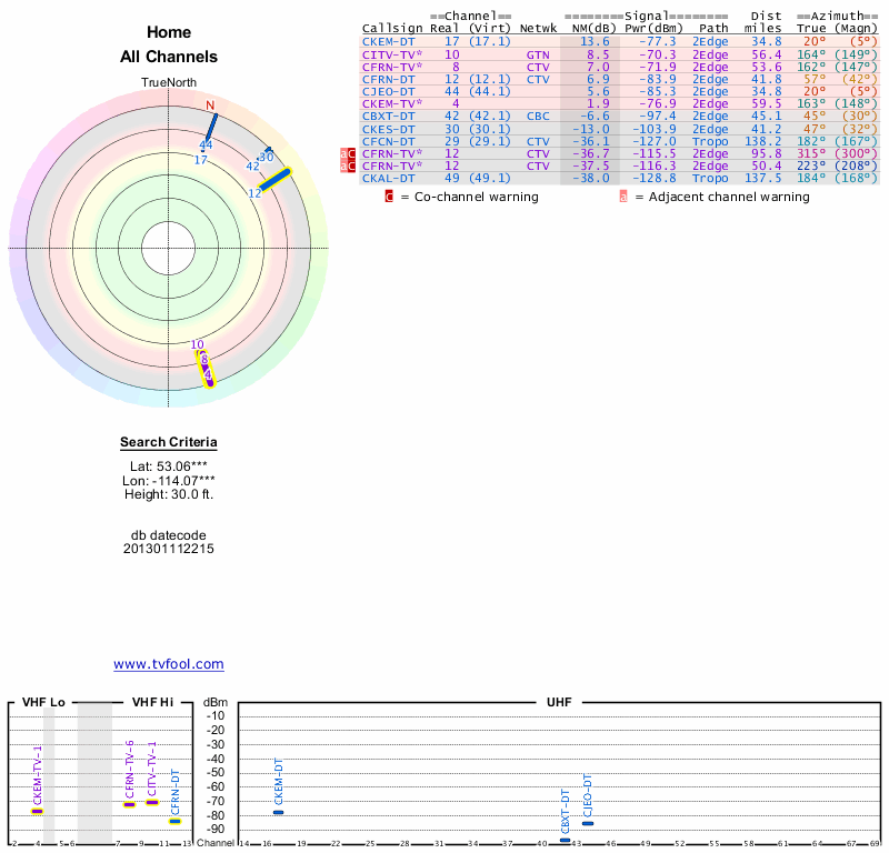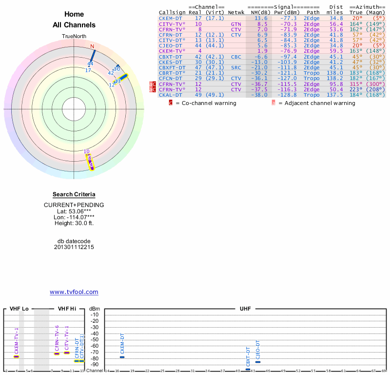 Here are the results for your location. The transmitter database was last updated on June 7, 2013. For more information about these plots and how to interpret them, please check out the Signal Analysis FAQ.