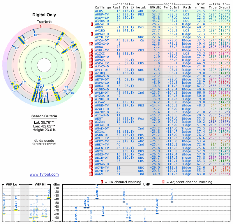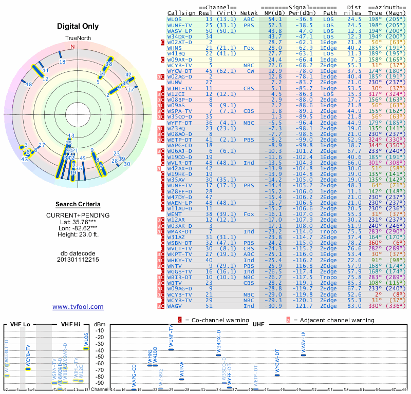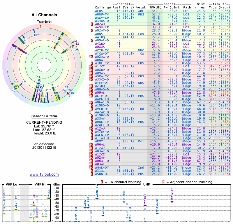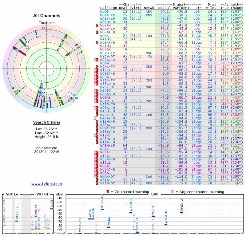 Here are the results for your location. The transmitter database was last updated on June 7, 2013. For more information about these plots and how to interpret them, please check out the Signal Analysis FAQ.