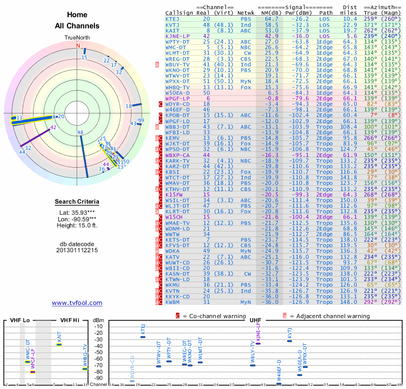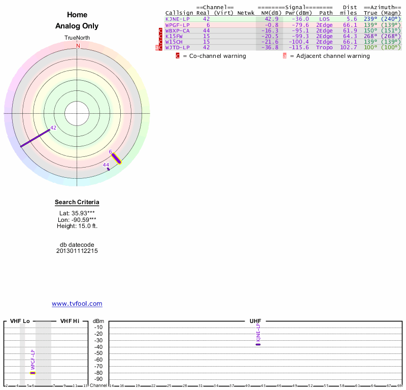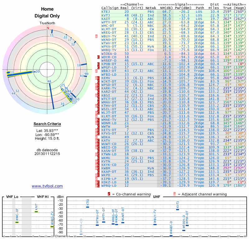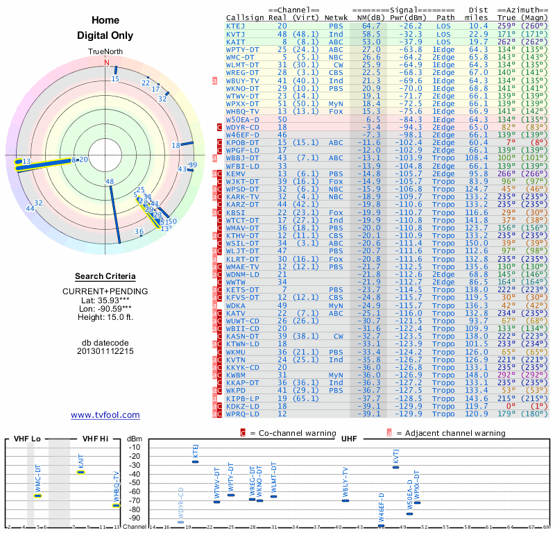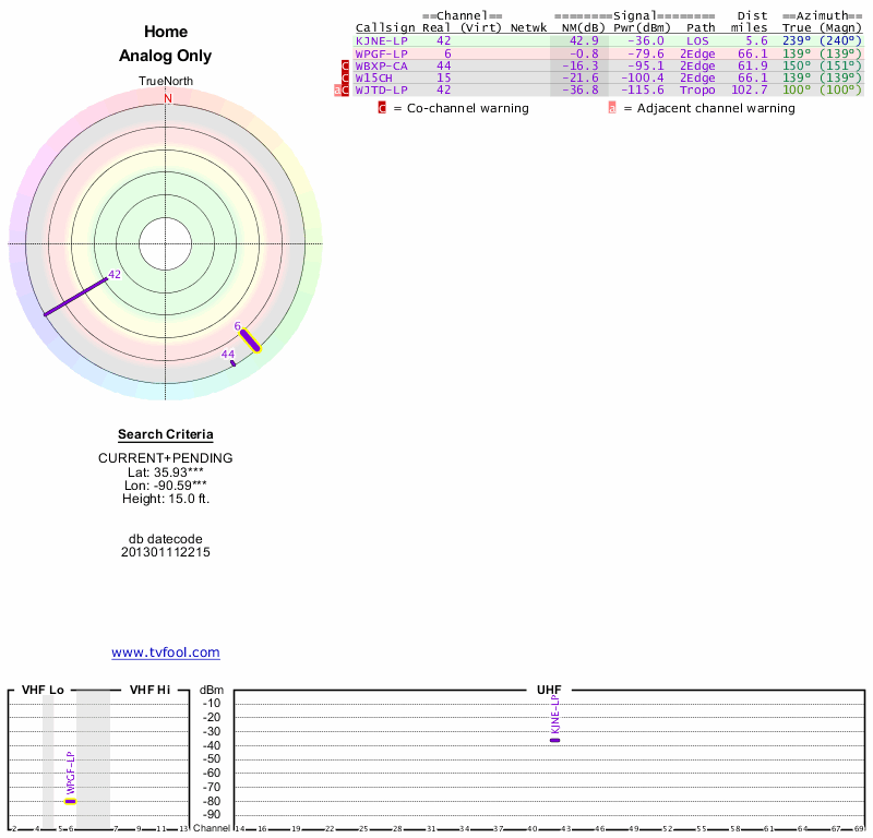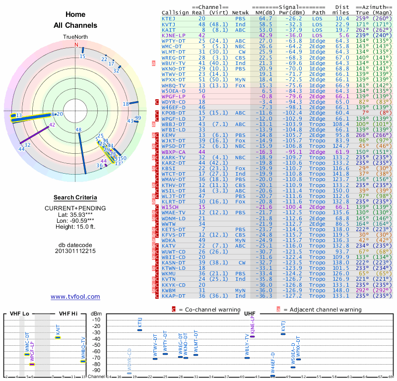 Here are the results for your location. The transmitter database was last updated on June 7, 2013. For more information about these plots and how to interpret them, please check out the Signal Analysis FAQ.