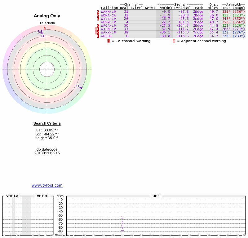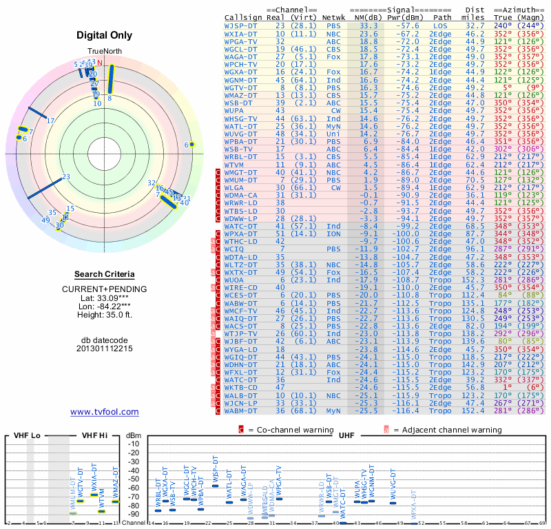 Here are the results for your location. The transmitter database was last updated on June 7, 2013. For more information about these plots and how to interpret them, please check out the Signal Analysis FAQ.