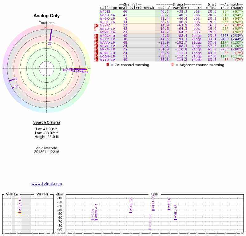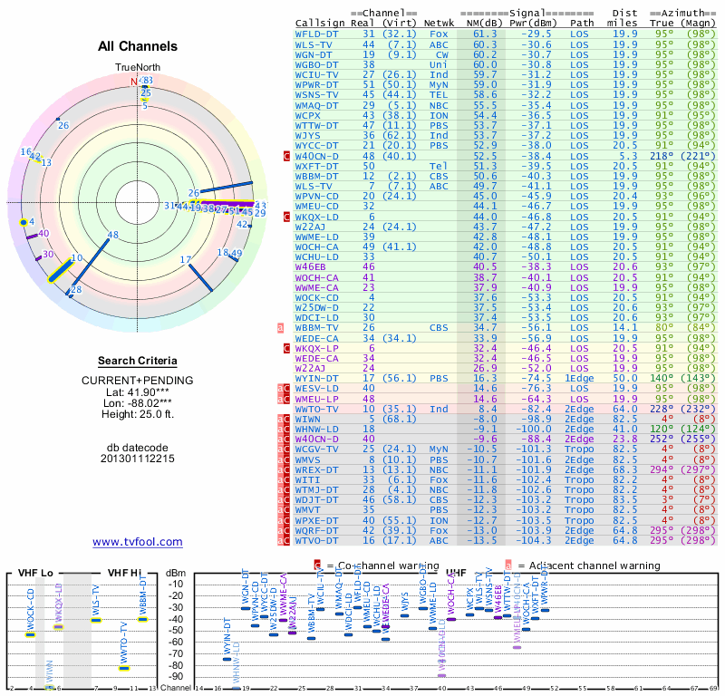Here are the results for your location. The transmitter database was last updated on June 7, 2013. For more information about these plots and how to interpret them, please check out the Signal Analysis FAQ.