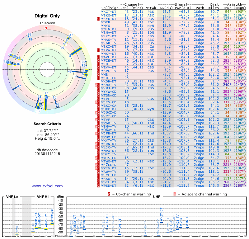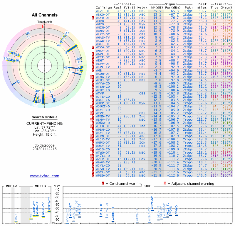 Here are the results for your location. The transmitter database was last updated on June 7, 2013. For more information about these plots and how to interpret them, please check out the Signal Analysis FAQ.