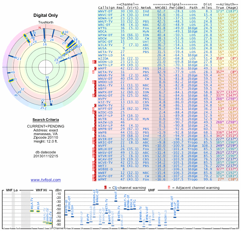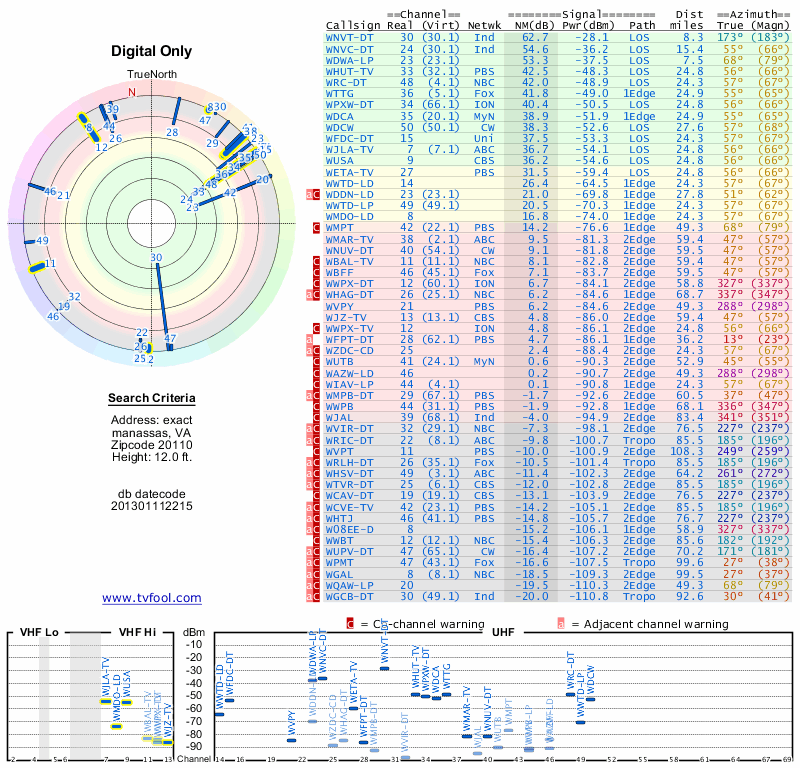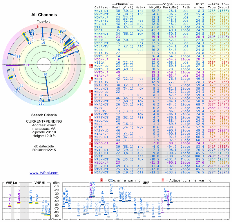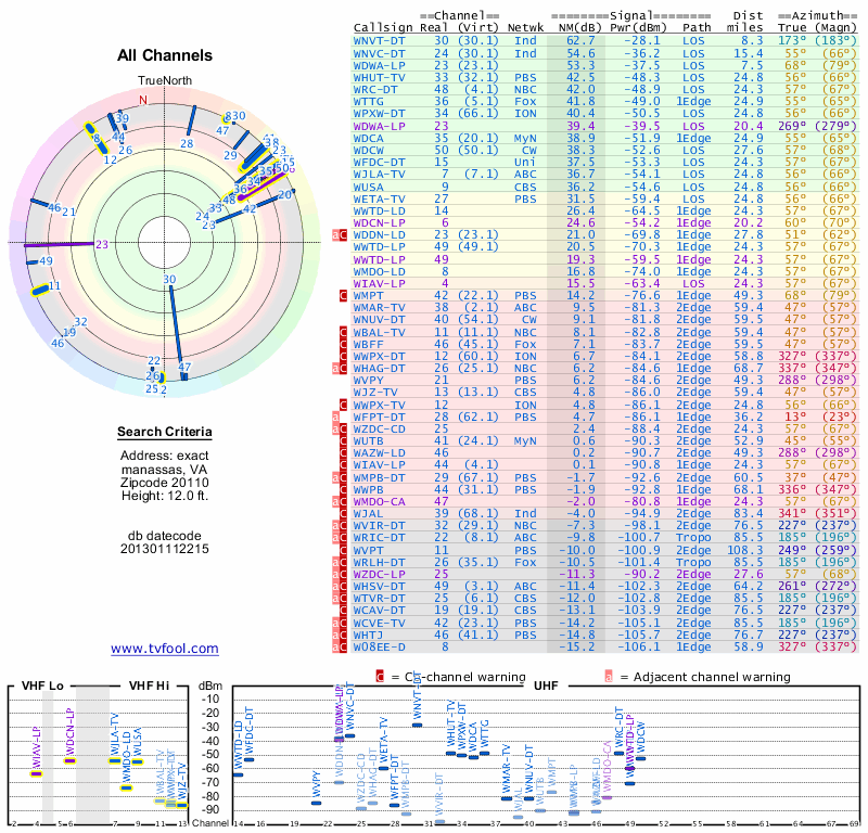 Here are the results for your location. The transmitter database was last updated on June 7, 2013. For more information about these plots and how to interpret them, please check out the Signal Analysis FAQ.