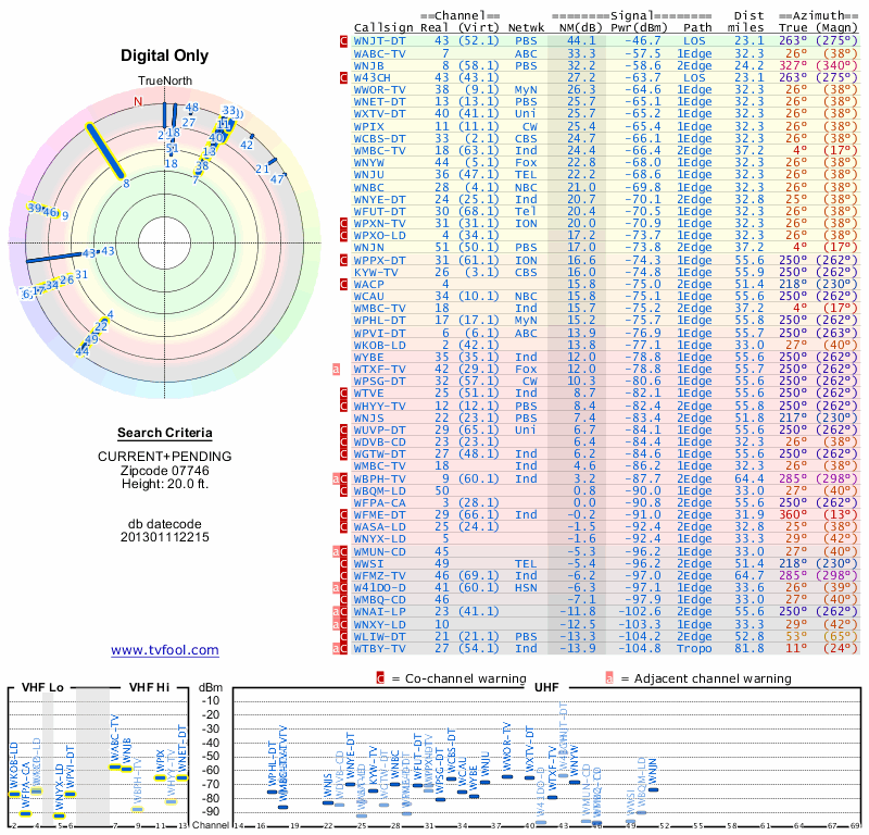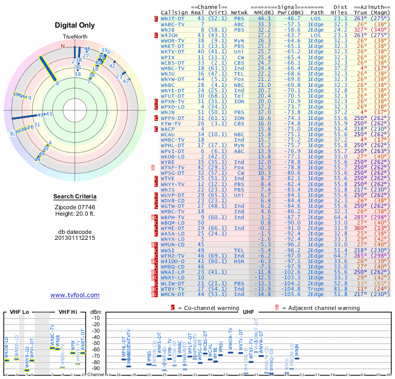 Here are the results for your location. The transmitter database was last updated on June 7, 2013. For more information about these plots and how to interpret them, please check out the Signal Analysis FAQ.