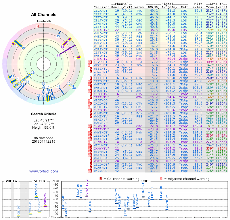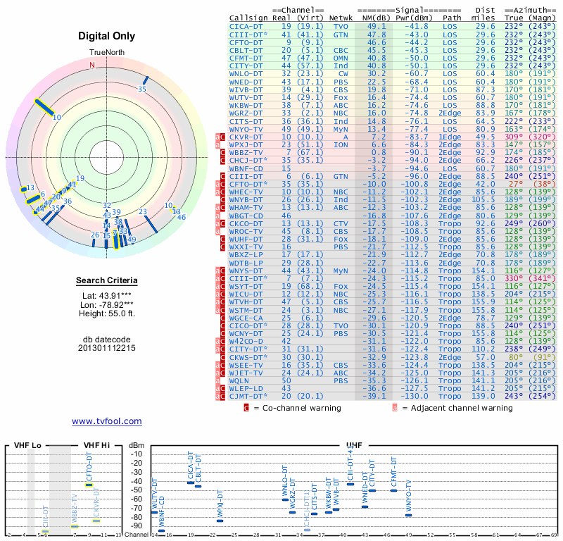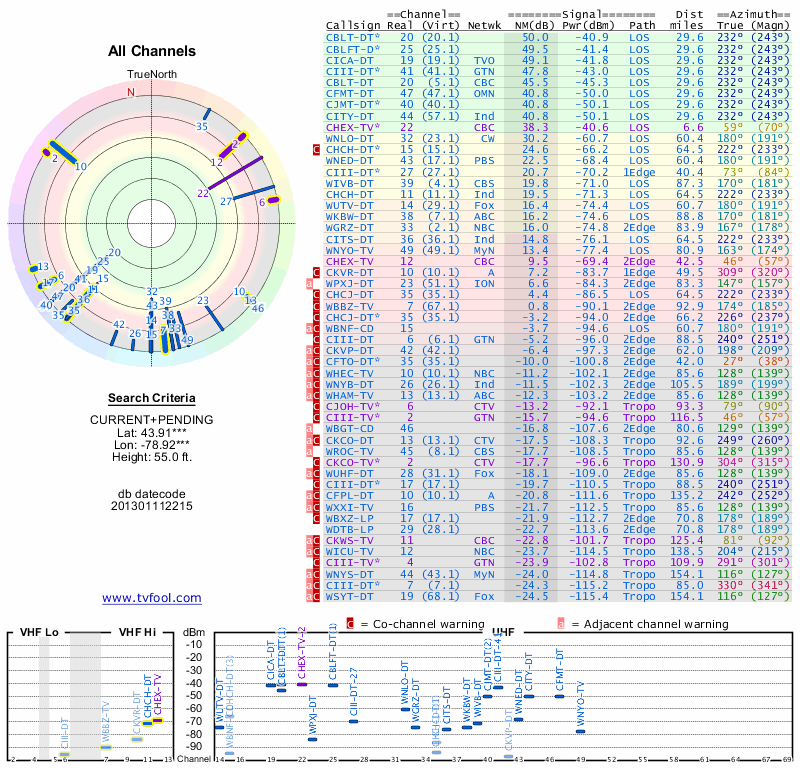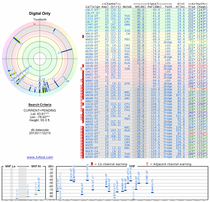 Here are the results for your location. The transmitter database was last updated on June 7, 2013. For more information about these plots and how to interpret them, please check out the Signal Analysis FAQ.