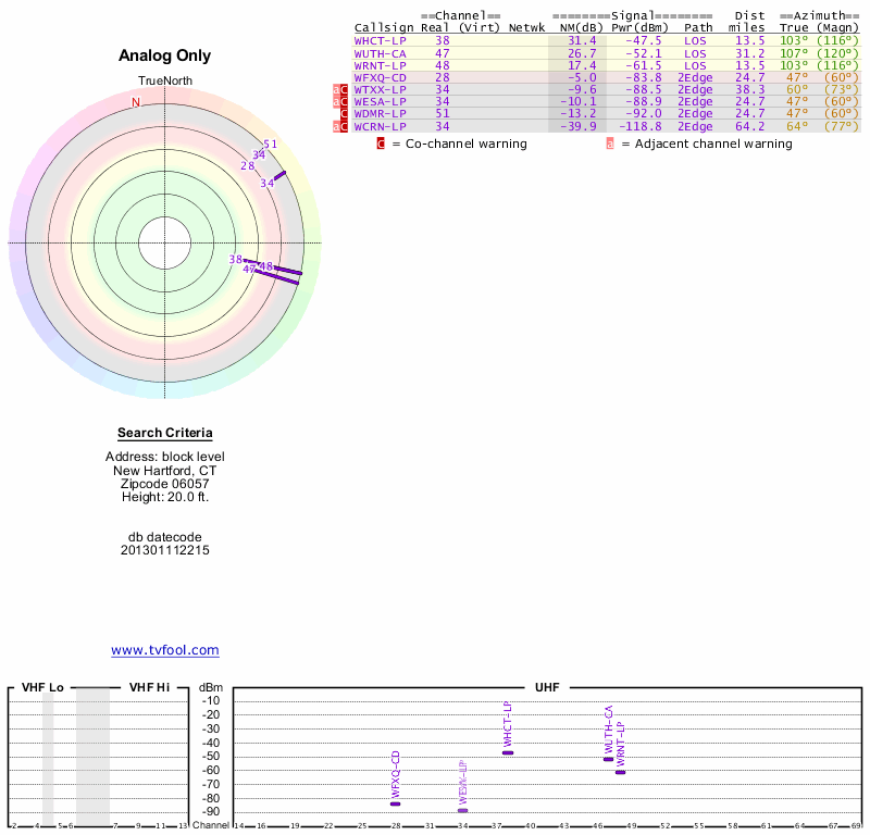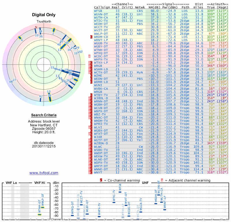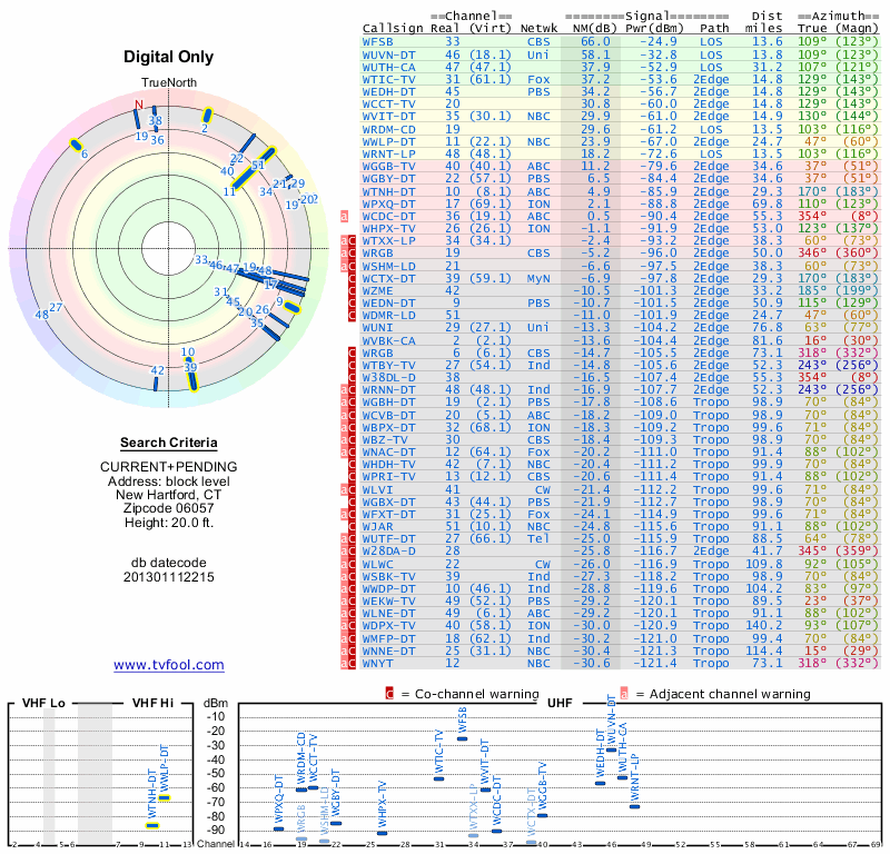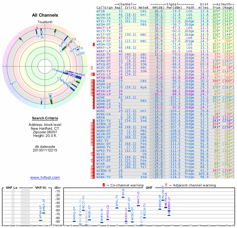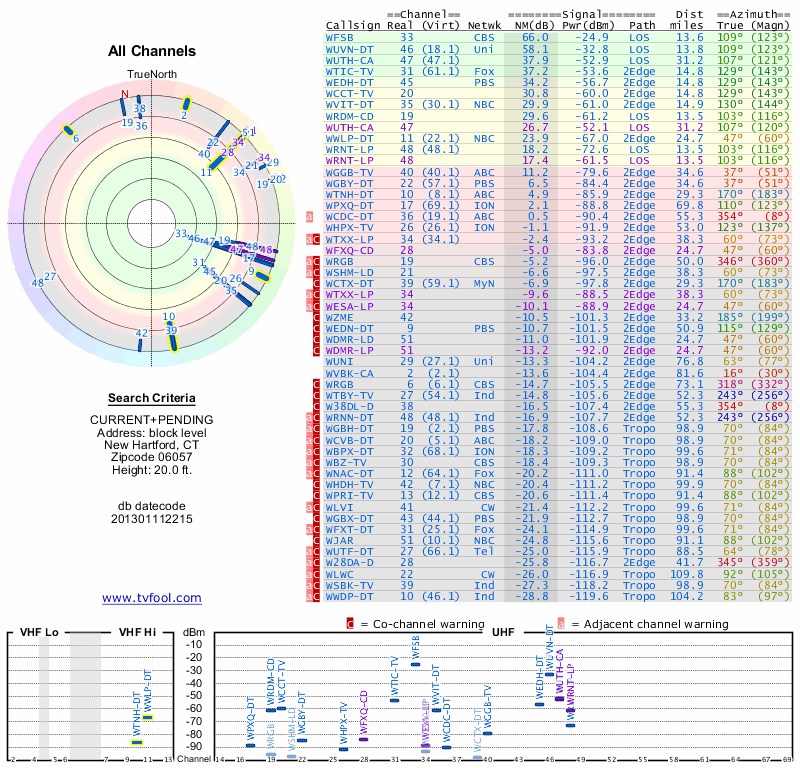 Here are the results for your location. The transmitter database was last updated on June 7, 2013. For more information about these plots and how to interpret them, please check out the Signal Analysis FAQ.