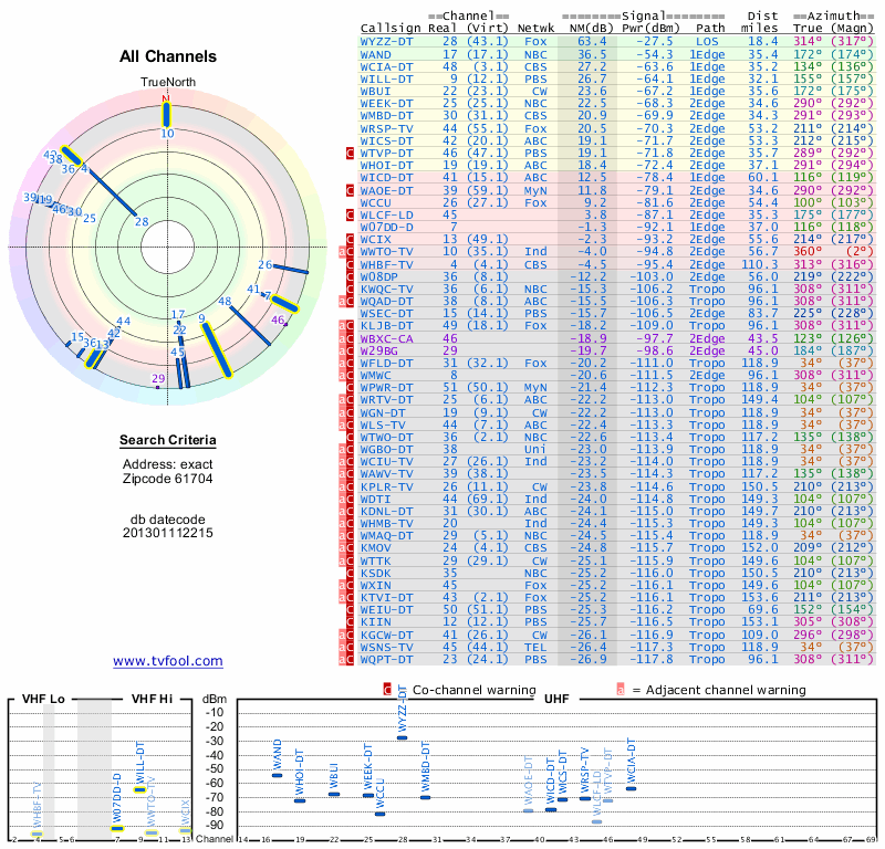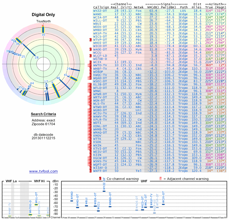 Here are the results for your location. The transmitter database was last updated on June 7, 2013. For more information about these plots and how to interpret them, please check out the Signal Analysis FAQ.