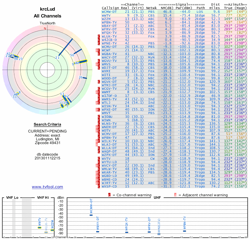 Here are the results for your location. The transmitter database was last updated on June 7, 2013. For more information about these plots and how to interpret them, please check out the Signal Analysis FAQ.
