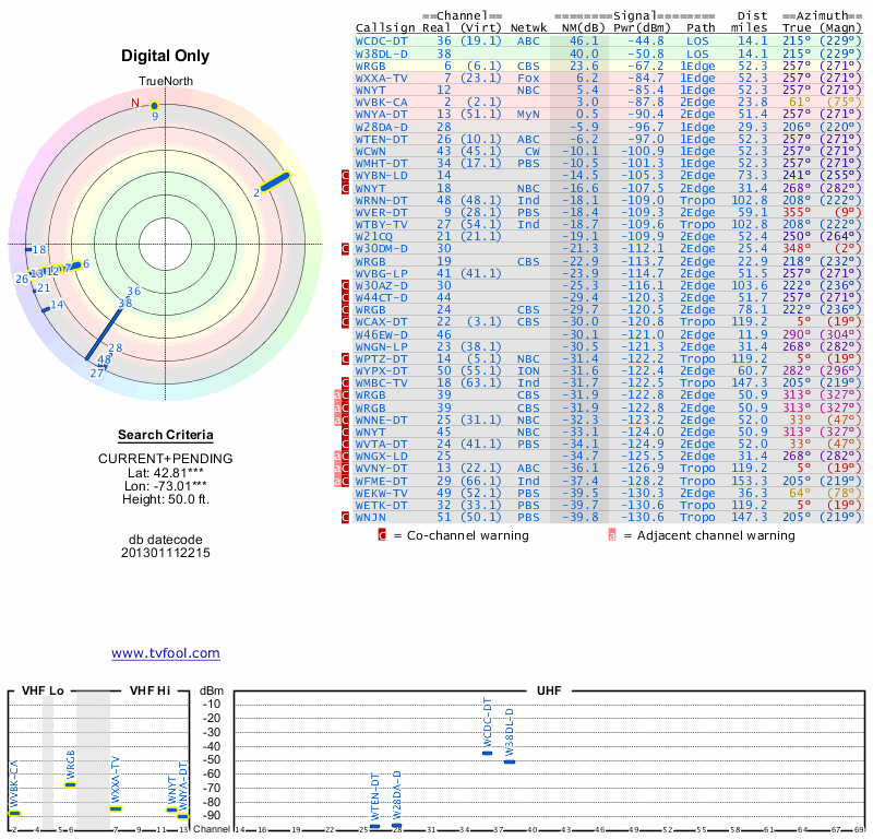 Here are the results for your location. The transmitter database was last updated on June 7, 2013. For more information about these plots and how to interpret them, please check out the Signal Analysis FAQ.