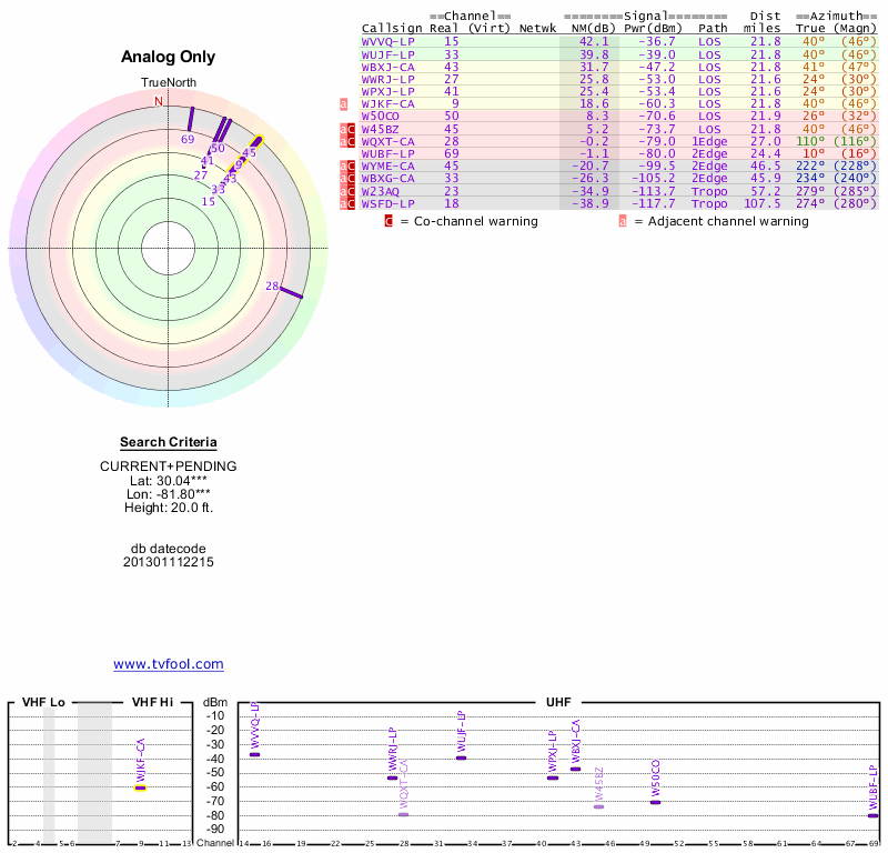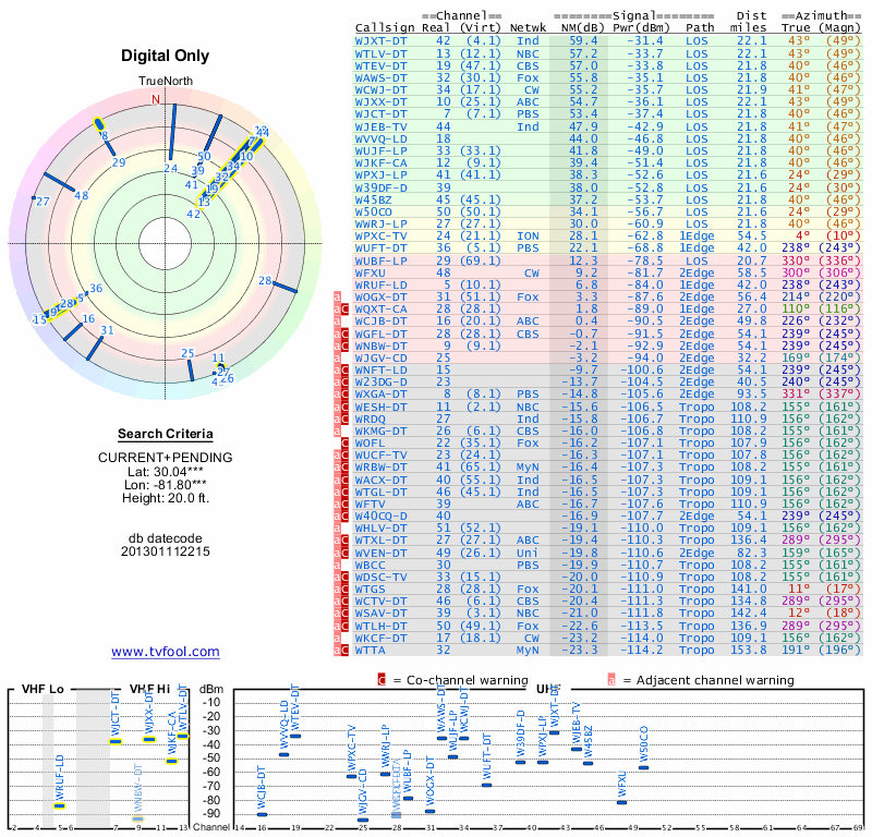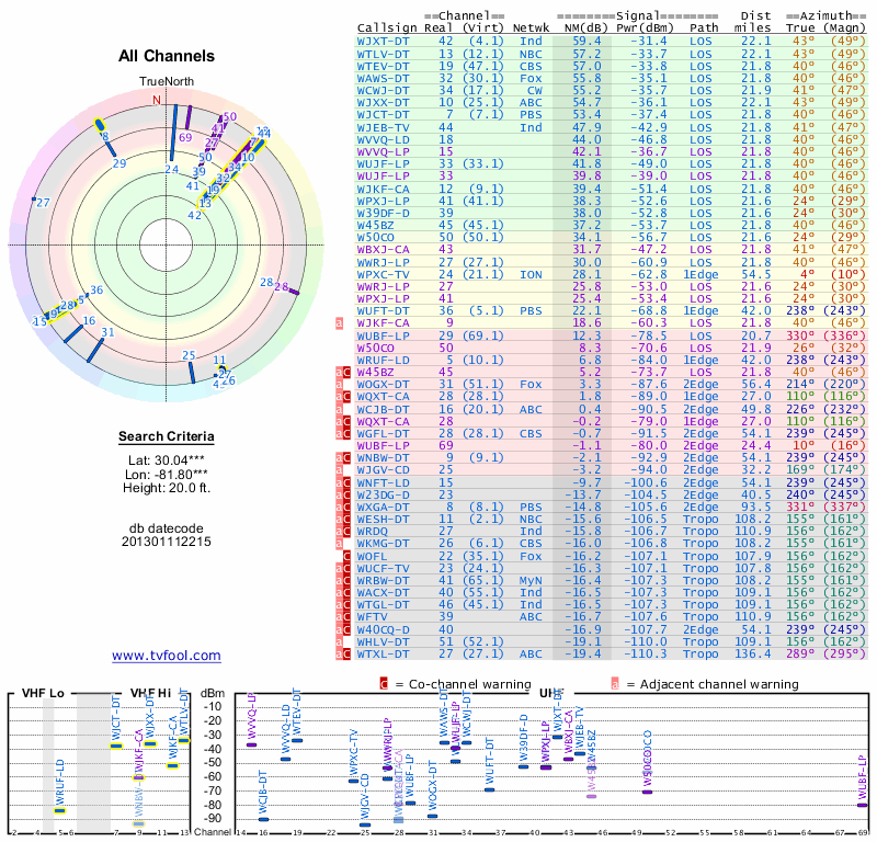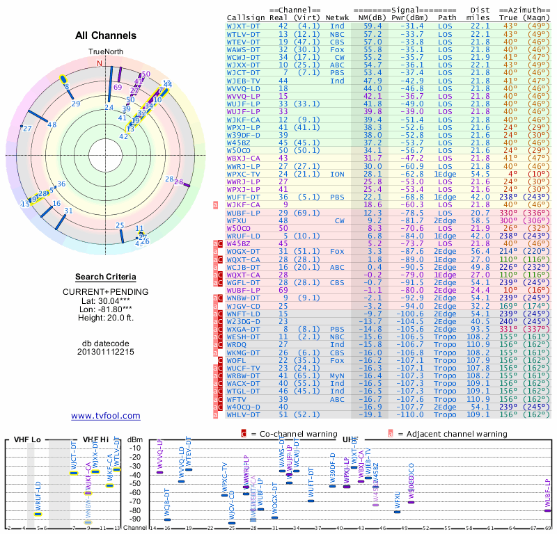 Here are the results for your location. The transmitter database was last updated on June 7, 2013. For more information about these plots and how to interpret them, please check out the Signal Analysis FAQ.