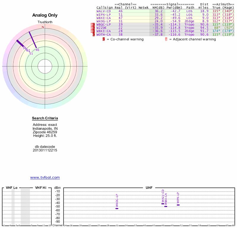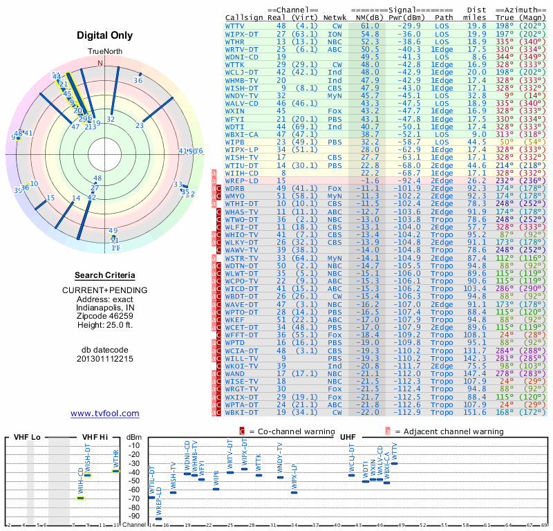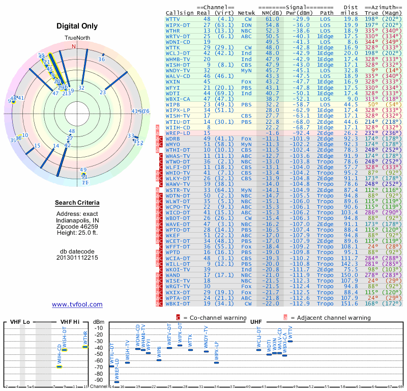 Here are the results for your location. The transmitter database was last updated on June 7, 2013. For more information about these plots and how to interpret them, please check out the Signal Analysis FAQ.