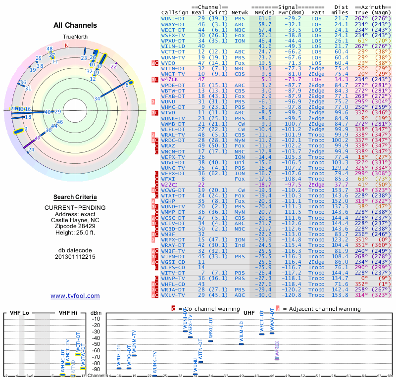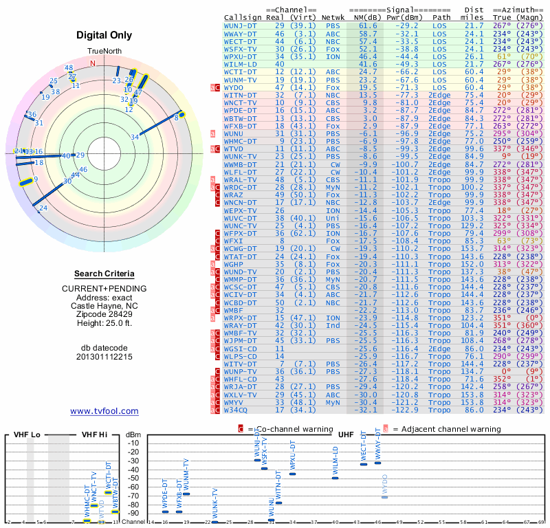 Here are the results for your location. The transmitter database was last updated on June 7, 2013. For more information about these plots and how to interpret them, please check out the Signal Analysis FAQ.