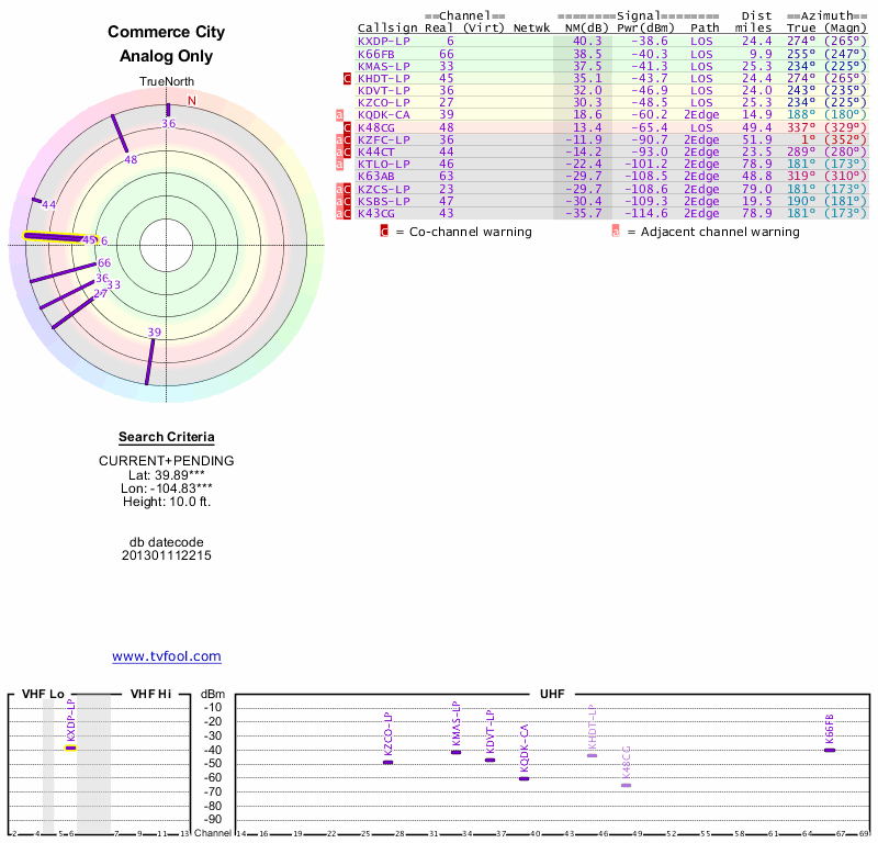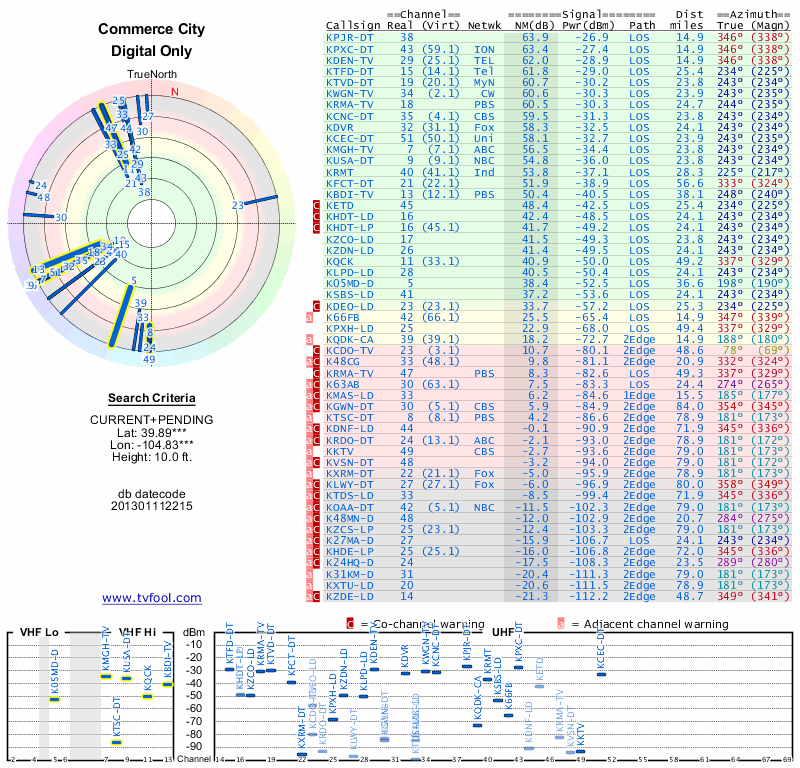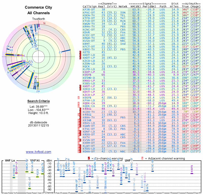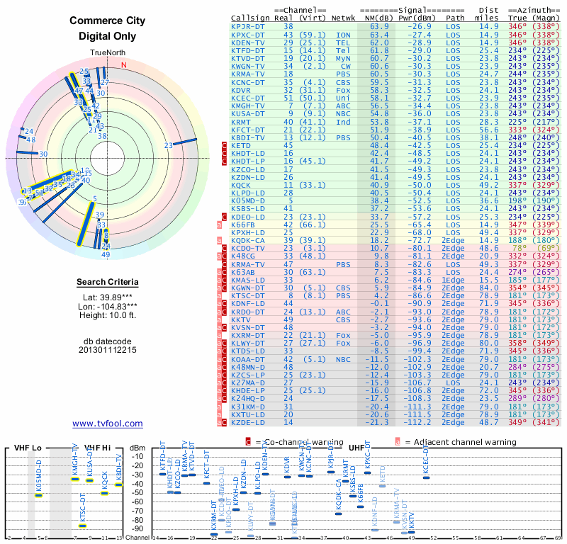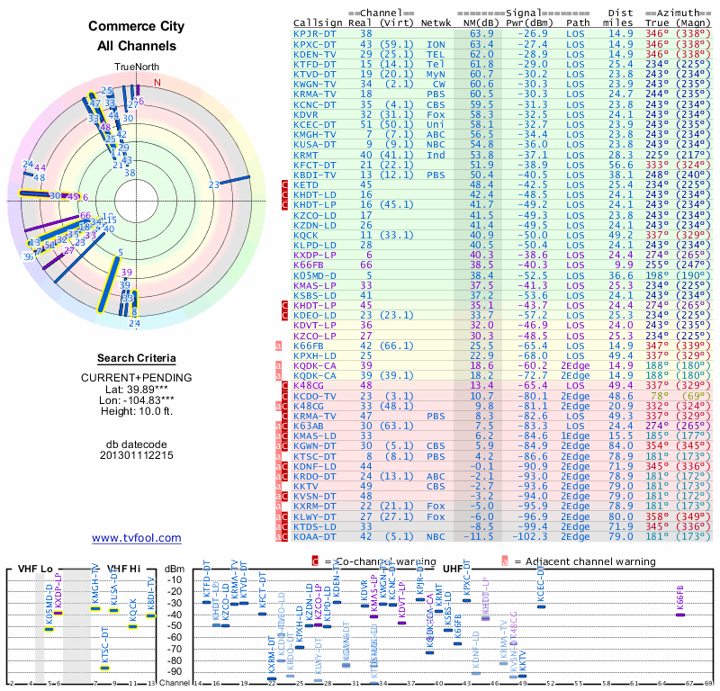 Here are the results for your location. The transmitter database was last updated on June 7, 2013. For more information about these plots and how to interpret them, please check out the Signal Analysis FAQ.