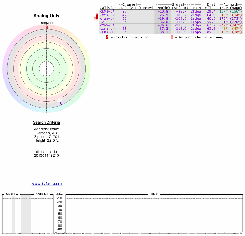 Here are the results for your location. The transmitter database was last updated on June 7, 2013. For more information about these plots and how to interpret them, please check out the Signal Analysis FAQ.