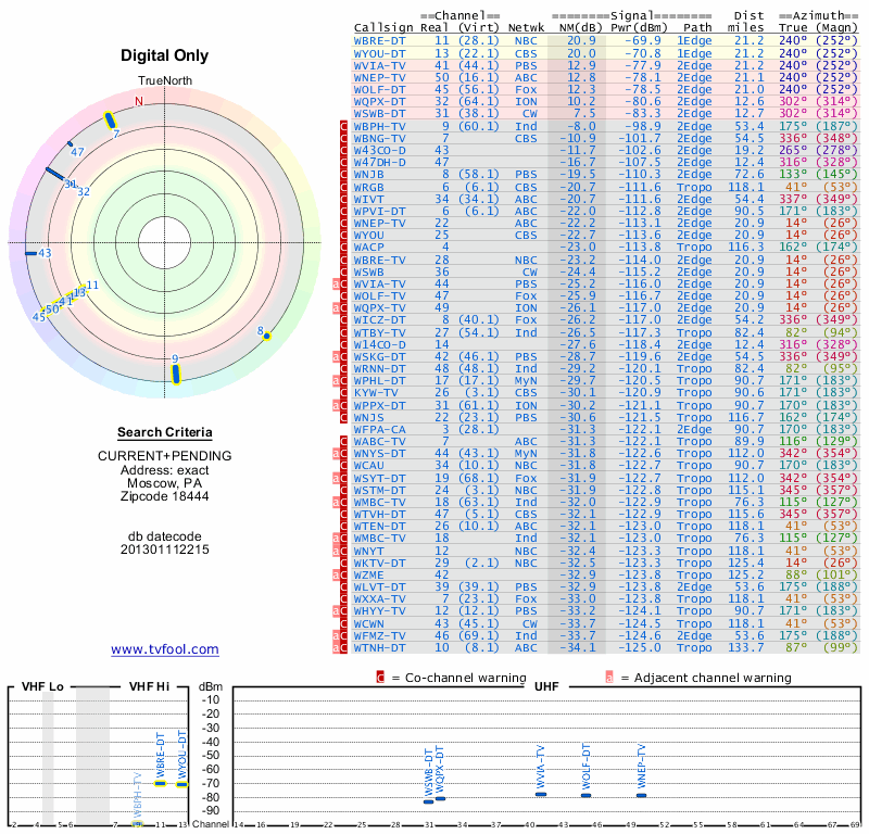 Here are the results for your location. The transmitter database was last updated on June 7, 2013. For more information about these plots and how to interpret them, please check out the Signal Analysis FAQ.