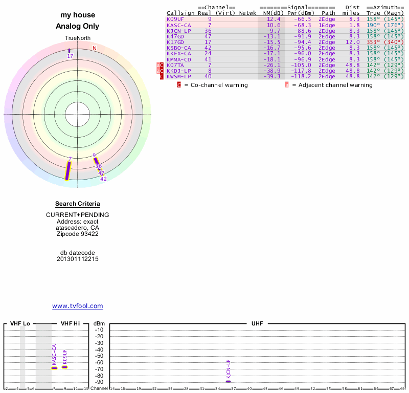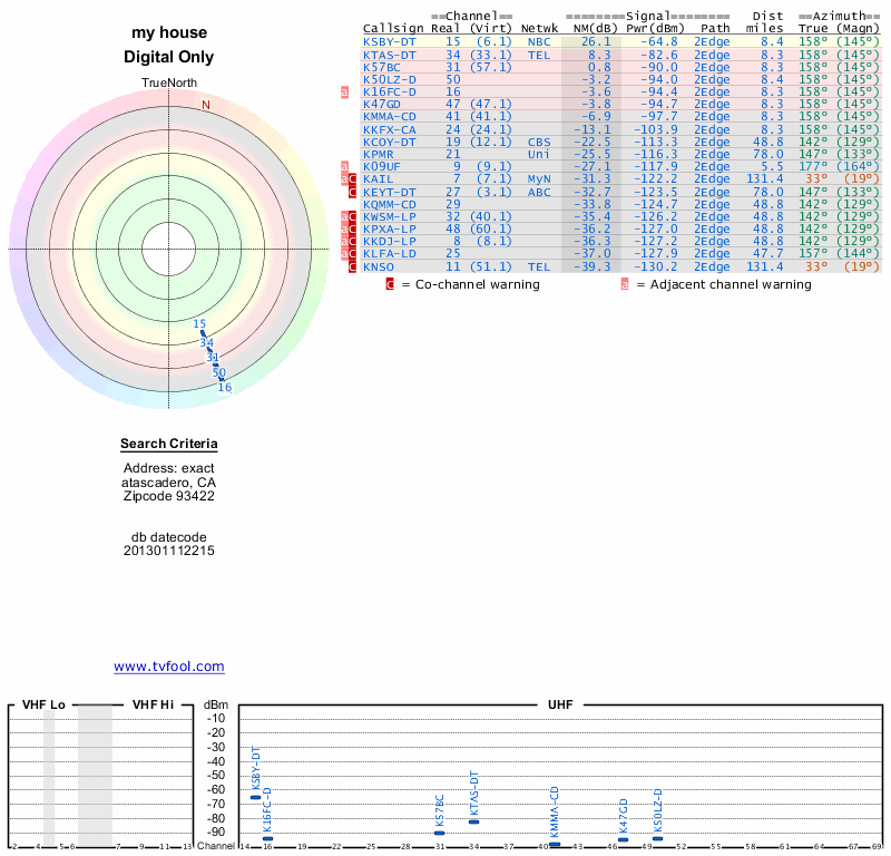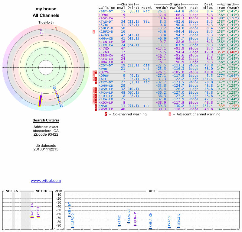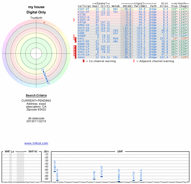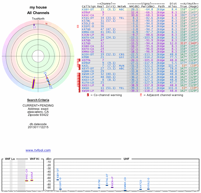 Here are the results for your location. The transmitter database was last updated on June 7, 2013. For more information about these plots and how to interpret them, please check out the Signal Analysis FAQ.