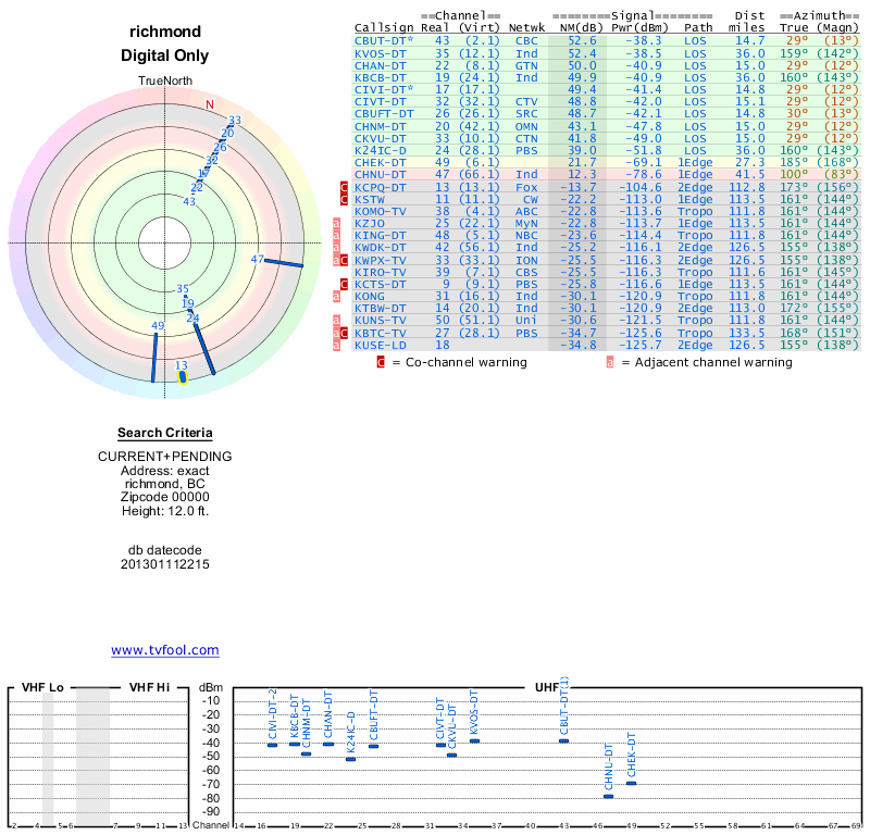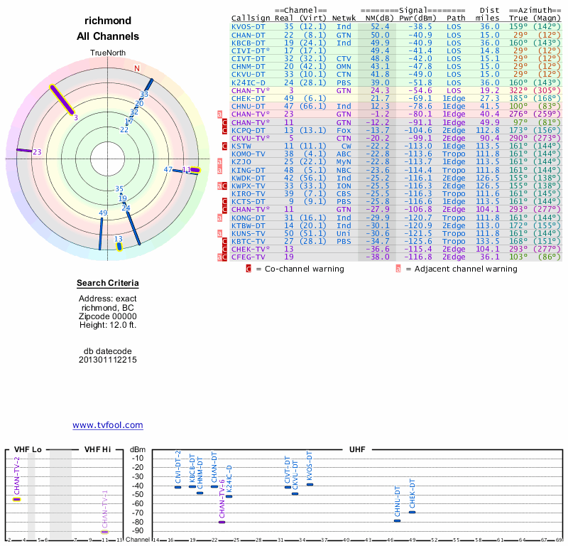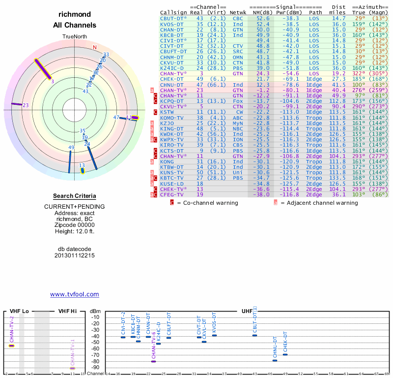 Here are the results for your location. The transmitter database was last updated on June 7, 2013. For more information about these plots and how to interpret them, please check out the Signal Analysis FAQ.