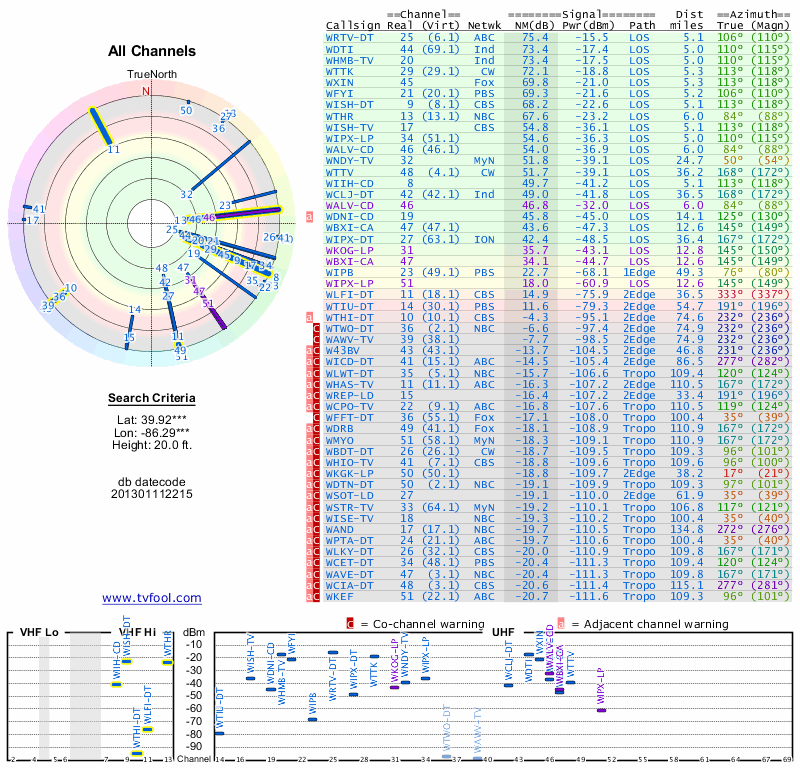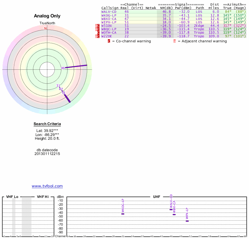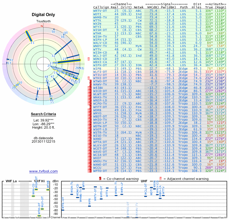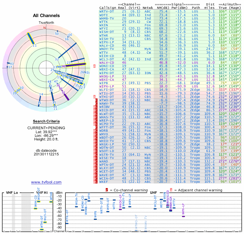 Here are the results for your location. The transmitter database was last updated on June 7, 2013. For more information about these plots and how to interpret them, please check out the Signal Analysis FAQ.