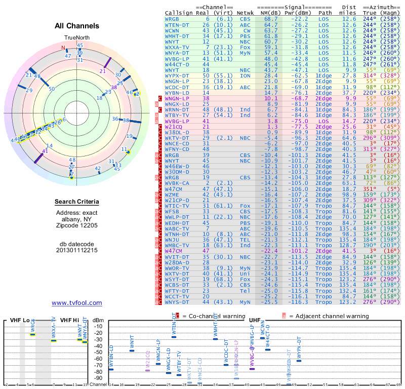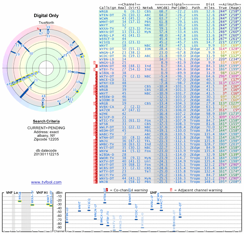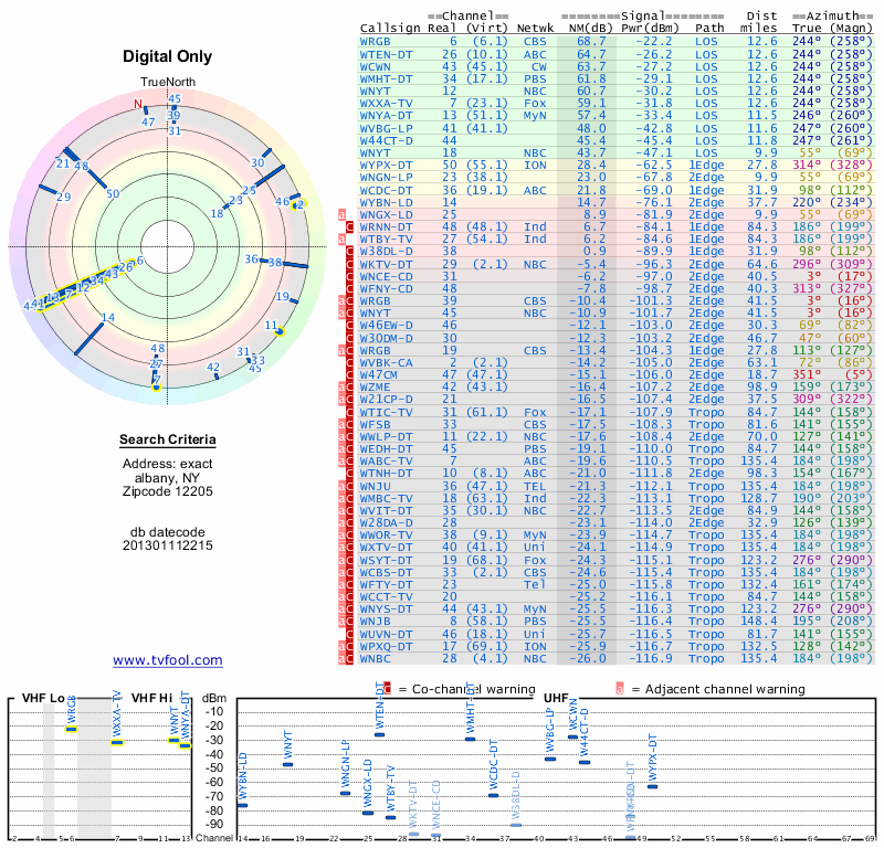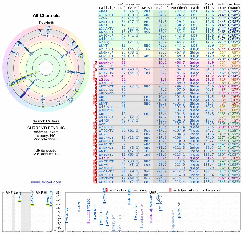 Here are the results for your location. The transmitter database was last updated on June 7, 2013. For more information about these plots and how to interpret them, please check out the Signal Analysis FAQ.