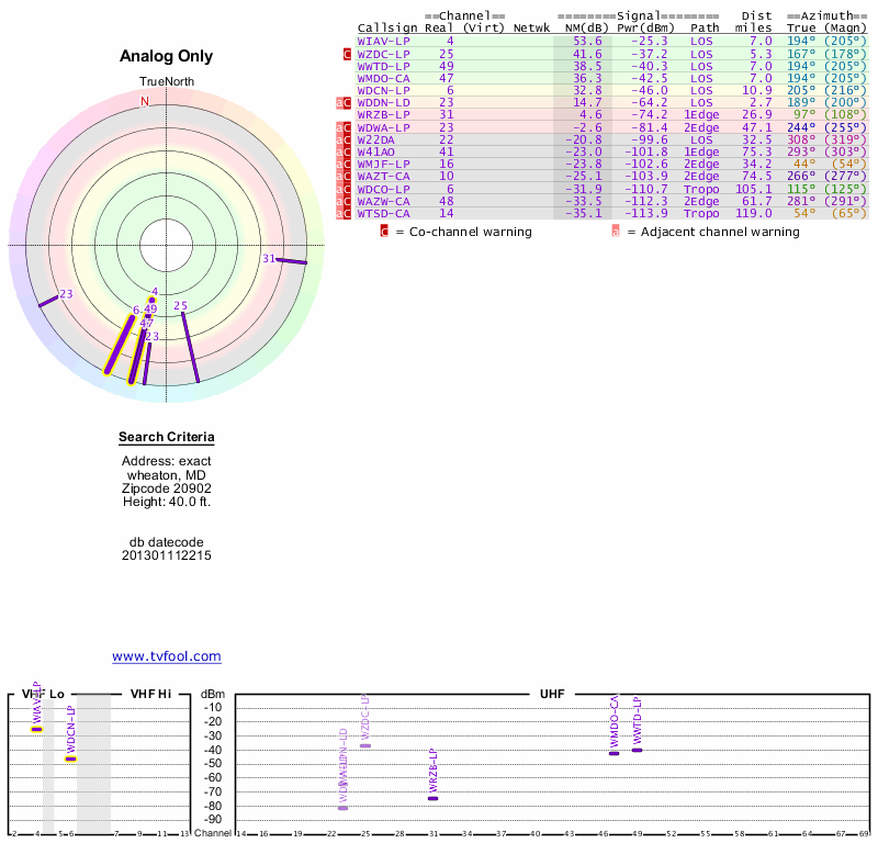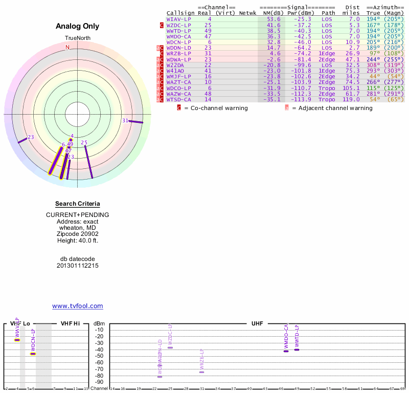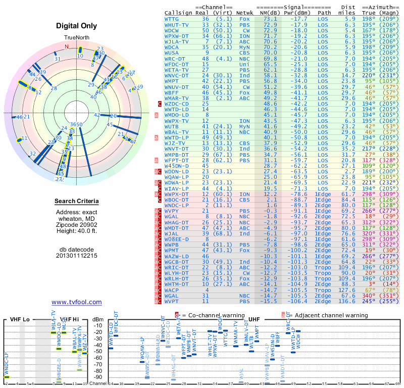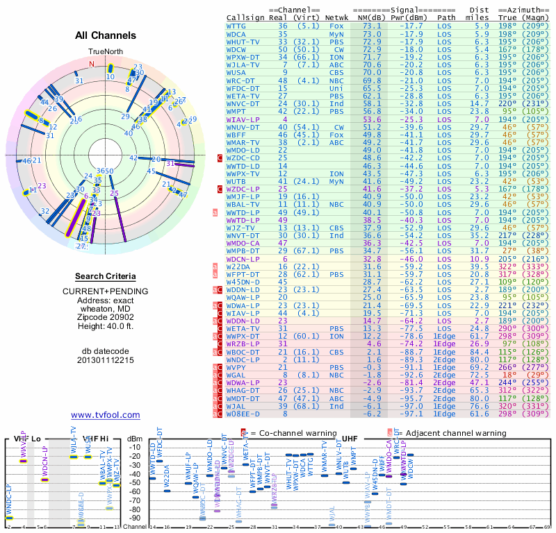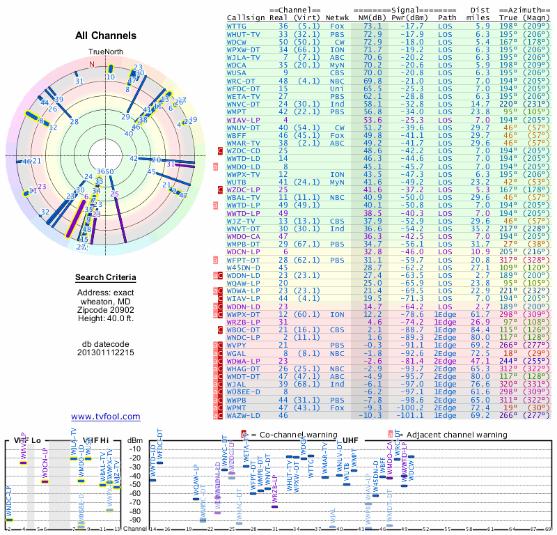Here are the results for your location. The transmitter database was last updated on June 7, 2013. For more information about these plots and how to interpret them, please check out the Signal Analysis FAQ.