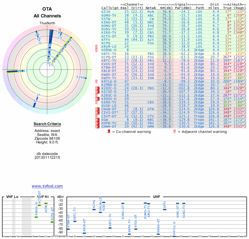 Here are the results for your location. The transmitter database was last updated on June 7, 2013. For more information about these plots and how to interpret them, please check out the Signal Analysis FAQ.