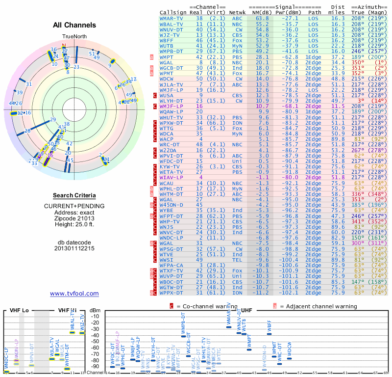 Here are the results for your location. The transmitter database was last updated on June 7, 2013. For more information about these plots and how to interpret them, please check out the Signal Analysis FAQ.