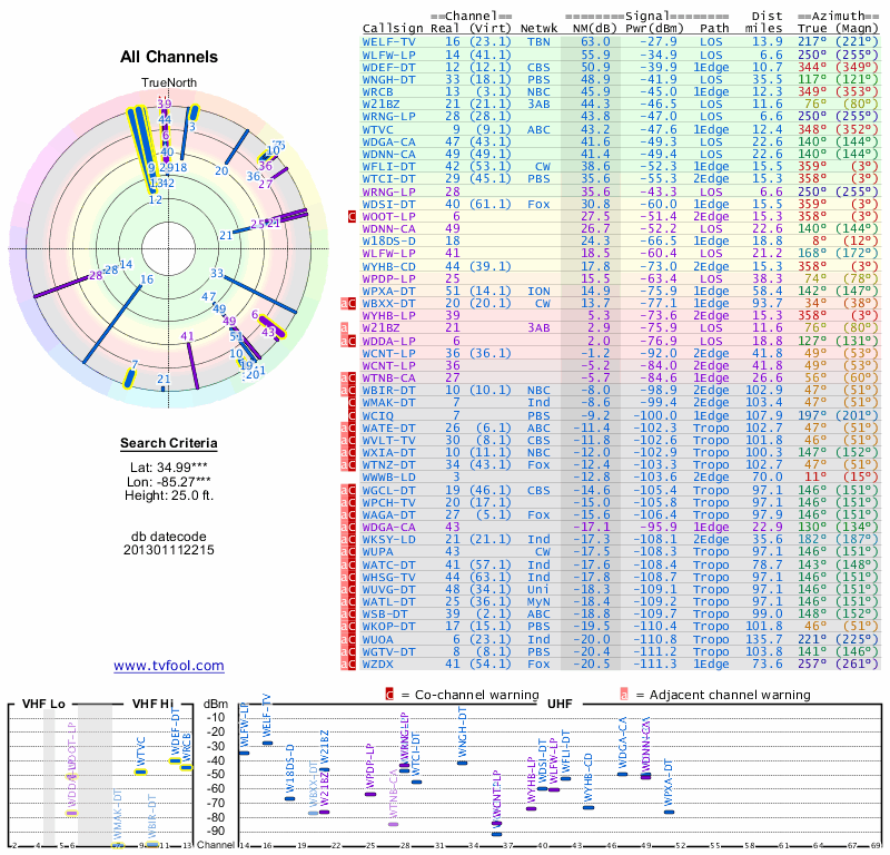 Here are the results for your location. The transmitter database was last updated on June 7, 2013. For more information about these plots and how to interpret them, please check out the Signal Analysis FAQ.